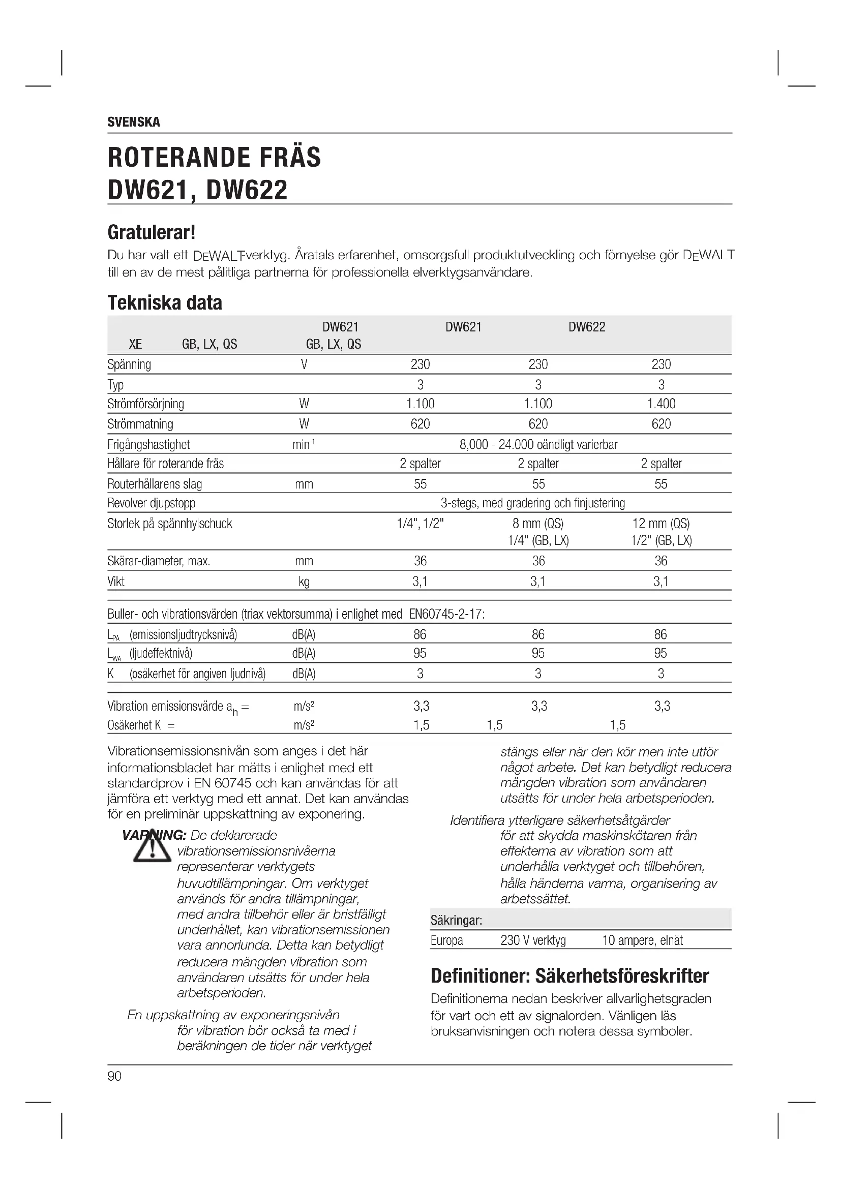 DW621, DW622 Svenska (översatt från de ursprungliga instruktionerna) stängs eller när den kör men inte utför något arbete. Det kan betydligt reducera mängden vibration som användaren utsätts för under hela arbetsperioden. Identifiera ytterligare säkerhetsåtgärder för att skydda maskinskötaren från effekterna av vibration som att underhålla verktyget och tillbehören, hålla händerna varma, organisering av arbetssättet. Säkringar: Europa 230 V verktyg 10 ampere, elnät Definitioner: Säkerhetsföreskrifter Definitionerna nedan beskriver allvarlighetsgraden för vart och ett av signalorden. Vänligen läs bruksanvisningen och notera dessa symboler.91 svenska Allmänna säkerhetsvarningar för elverktyg VARNING! Läs säkerhetsvarningarna och instruktionerna. Om varningarna och instruktionerna inte följs kan det resultera i elektrisk stöt, brand och/eller allvarlig personskada.