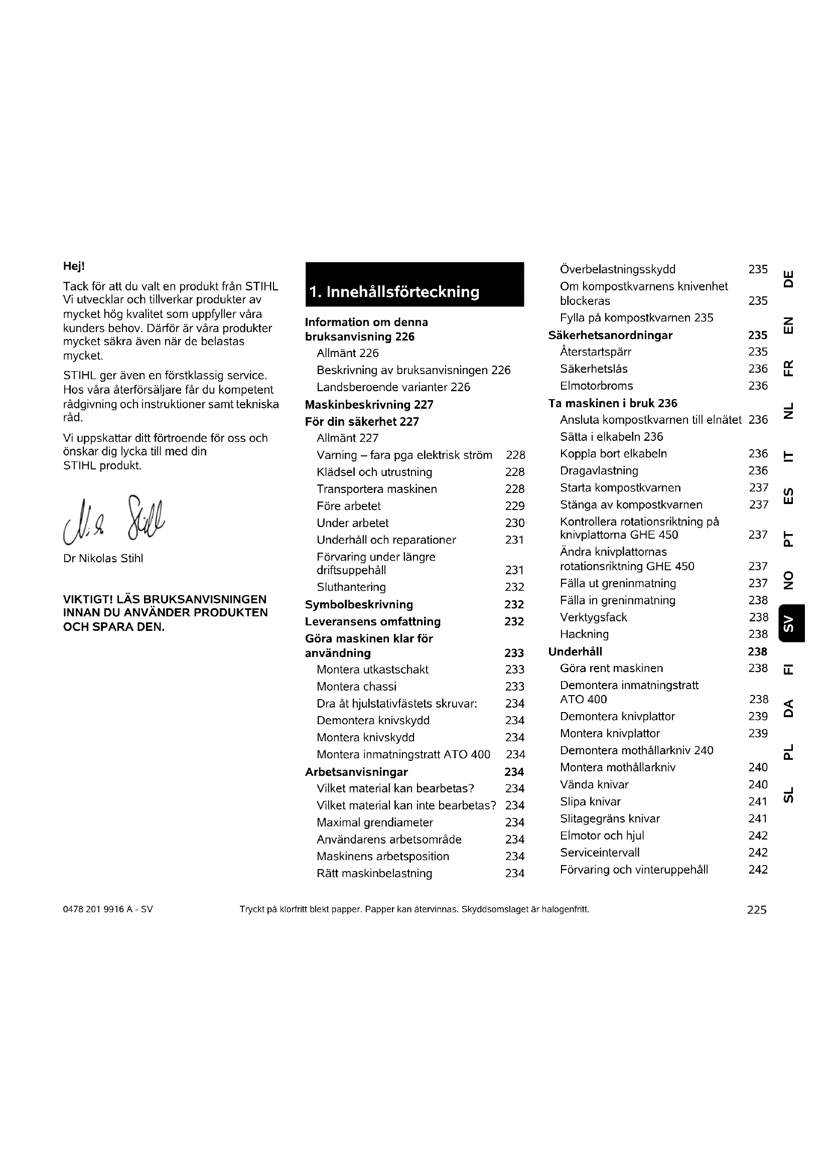 Information om denna bruksanvisning 226 Allmänt 226 Beskrivning av bruksanvisningen 226 Landsberoende varianter 226 Maskinbeskrivning 227 För din säkerhet 227 Allmänt 227 Varning – fara pga elektrisk ström 228 Klädsel och utrustning 228 Transportera maskinen 228 Före arbetet 229 Under arbetet 230 Underhåll och reparationer 231 Förvaring under längre driftsuppehåll 231 Sluthantering 232 Symbolbeskrivning 232 Leveransens omfattning 232 Göra maskinen klar för användning 233 Montera utkastschakt 233 Montera chassi 233 Dra åt hjulstativfästets skruvar: 234 Demontera knivskydd 234 Montera knivskydd 234 Montera inmatningstratt ATO 400 234 Arbetsanvisningar 234 Vilket material kan bearbetas? 234 Vilket material kan inte bearbetas? 234 Maximal grendiameter 234 Användarens arbetsområde 234 Maskinens arbetsposition 234 Rätt maskinbelastning 234 Överbelastningsskydd 235 Om kompostkvarnens knivenhet blockeras 235 Fylla på kompostkvarnen 235 Säkerhetsanordningar 235 Återstartspärr 235 Säkerhetslås 236 Elmotorbroms 236 Ta maskinen i bruk 236 Ansluta kompostkvarnen till elnätet 236 Sätta i elkabeln 236 Koppla bort elkabeln 236 Dragavlastning 236 Starta kompostkvarnen 237 Stänga av kompostkvarnen 237 Kontrollera rotationsriktning på knivplattorna GHE 450 237 Ändra knivplattornas rotationsriktning GHE 450 237 Fälla ut greninmatning 237 Fälla in greninmatning 238 Verktygsfack 238 Hackning 238 Underhåll 238 Göra rent maskinen 238 Demontera inmatningstratt ATO 400 238 Demontera knivplattor 239 Montera knivplattor 239 Demontera mothållarkniv 240 Montera mothållarkniv 240 Vända knivar 240 Slipa knivar 241 Slitagegräns knivar 241 Elmotor och hjul 242 Serviceintervall 242 Förvaring och vinteruppehåll 2420478 201 9916 A - SV