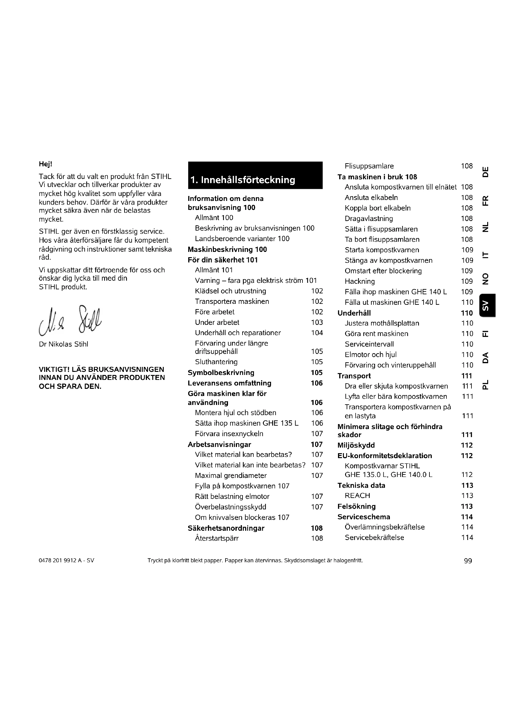 Information om denna bruksanvisning 100 Allmänt 100 Beskrivning av bruksanvisningen 100 Landsberoende varianter 100 Maskinbeskrivning 100 För din säkerhet 101 Allmänt 101 Varning – fara pga elektrisk ström 101 Klädsel och utrustning 102 Transportera maskinen 102 Före arbetet 102 Under arbetet 103 Underhåll och reparationer 104 Förvaring under längre driftsuppehåll 105 Sluthantering 105 Symbolbeskrivning 105 Leveransens omfattning 106 Göra maskinen klar för användning 106 Montera hjul och stödben 106 Sätta ihop maskinen GHE 135 L 106 Förvara insexnyckeln 107 Arbetsanvisningar 107 Vilket material kan bearbetas? 107 Vilket material kan inte bearbetas? 107 Maximal grendiameter 107 Fylla på kompostkvarnen 107 Rätt belastning elmotor 107 Överbelastningsskydd 107 Om knivvalsen blockeras 107 Säkerhetsanordningar 108 Återstartspärr 108 Flisuppsamlare 108 Ta maskinen i bruk 108 Ansluta kompostkvarnen till elnätet 108 Ansluta elkabeln 108 Koppla bort elkabeln 108 Dragavlastning 108 Sätta i flisuppsamlaren 108 Ta bort flisuppsamlaren 108 Starta kompostkvarnen 109 Stänga av kompostkvarnen 109 Omstart efter blockering 109 Hackning 109 Fälla ihop maskinen GHE 140 L 109 Fälla ut maskinen GHE 140 L 110 Underhåll 110 Justera mothållsplattan 110 Göra rent maskinen 110 Serviceintervall 110 Elmotor och hjul 110 Förvaring och vinteruppehåll 110 Transport 111 Dra eller skjuta kompostkvarnen 111 Lyfta eller bära kompostkvarnen 111 Transportera kompostkvarnen på en lastyta 111 Minimera slitage och förhindra skador 111 Miljöskydd 112 EU-konformitetsdeklaration 112 Kompostkvarnar STIHL