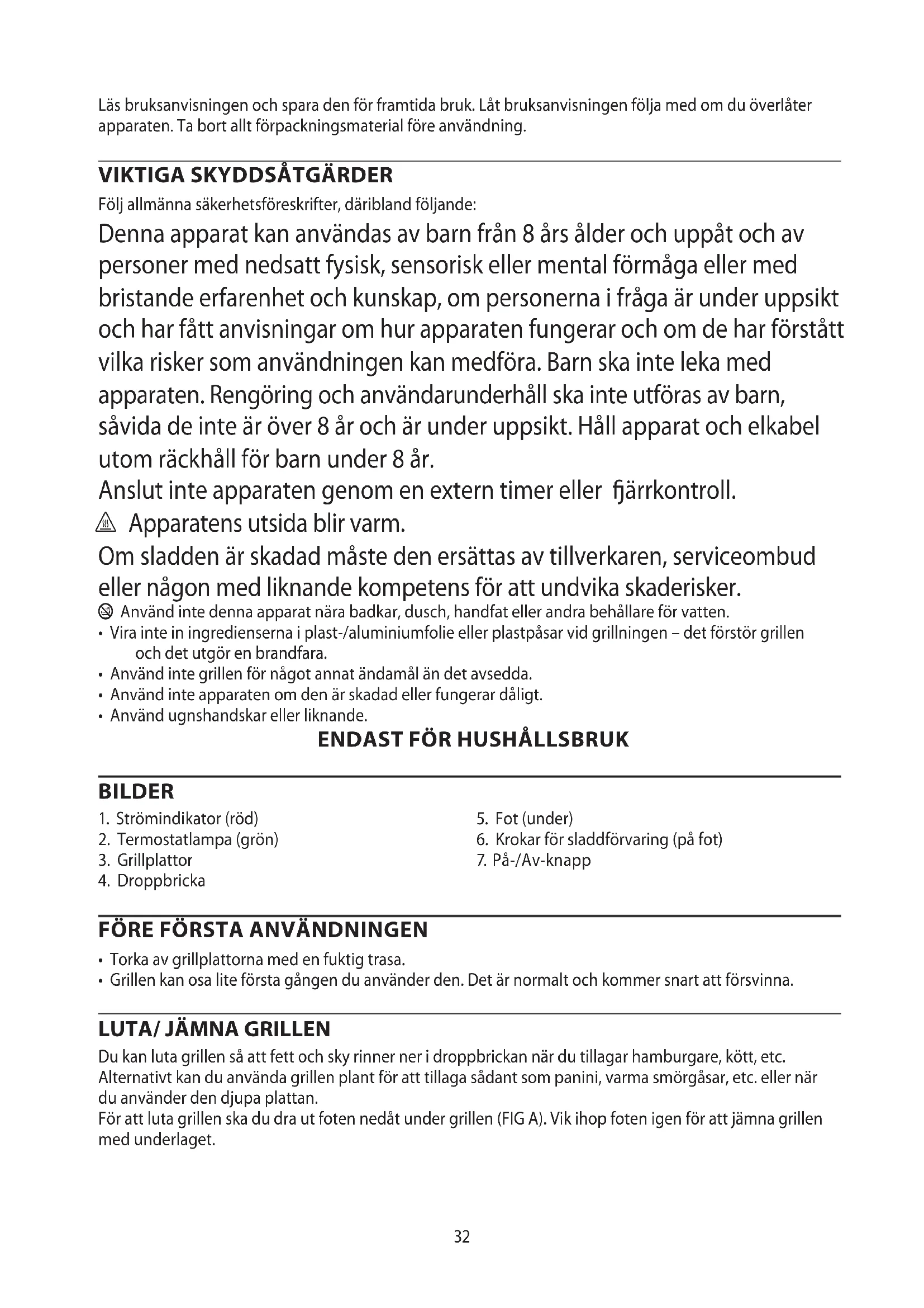 Följ allmänna säkerhetsföreskrifter, däribland följande: Denna apparat kan användas av barn från 8 års ålder och uppåt och av personer med nedsatt fysisk, sensorisk eller mental förmåga eller med bristande erfarenhet och kunskap, om personerna i fråga är under uppsikt och har fått anvisningar om hur apparaten fungerar och om de har förstått vilka risker som användningen kan medföra. Barn ska inte leka med apparaten. Rengöring och användarunderhåll ska inte utföras av barn, såvida de inte är över 8 år och är under uppsikt. Håll apparat och elkabel utom räckhåll för barn under 8 år. Anslut inte apparaten genom en extern timer eller ärrkontroll. ¬ Apparatens utsida blir varm. Om sladden är skadad måste den ersättas av tillverkaren, serviceombud eller någon med liknande kompetens för att undvika skaderisker. b Använd inte denna apparat nära badkar, dusch, handfat eller andra behållare för vatten.