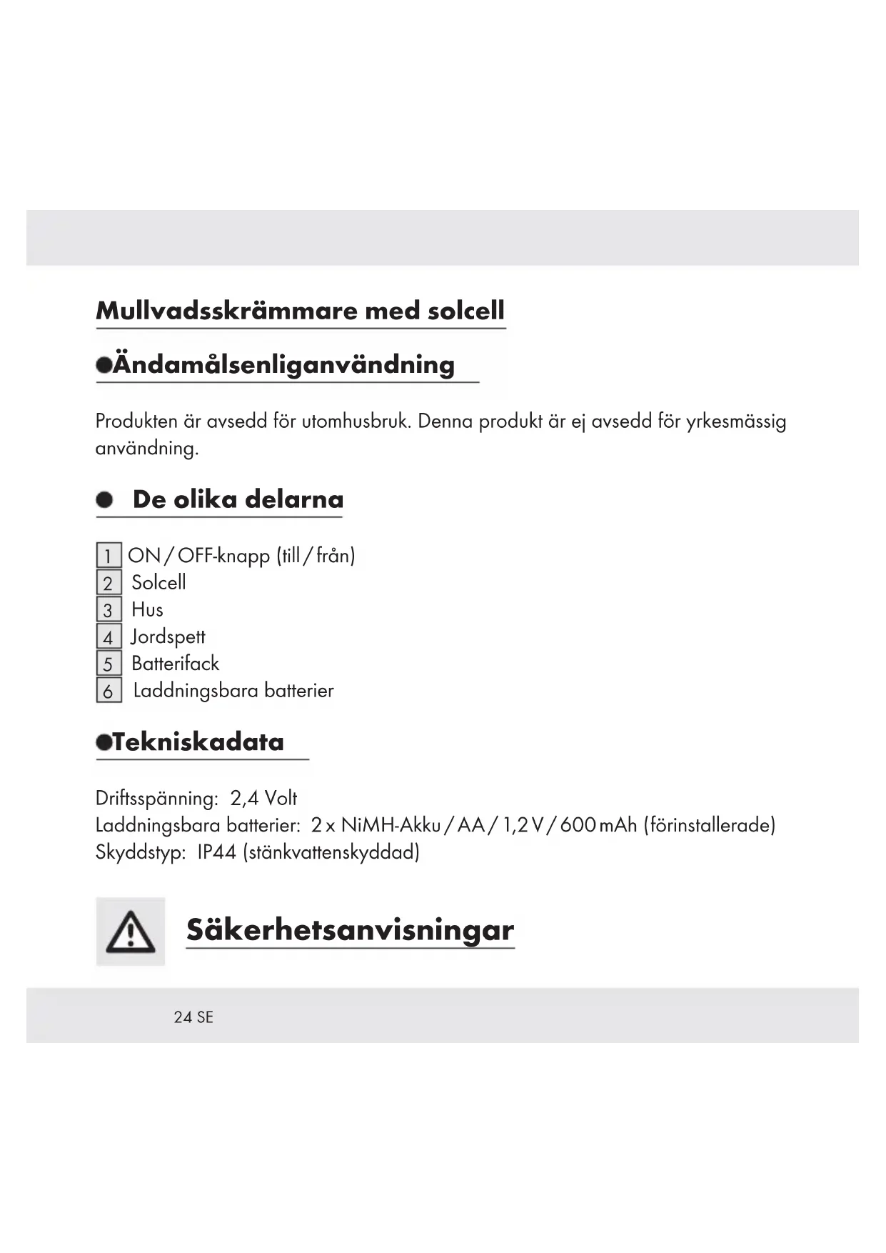 Laddningsbara batterier Tekniska data Driftsspänning: 2,4 Volt Laddningsbara batterier: 2 x NiMH-Akku / AA / 1,2 V / 600 mAh (förinstallerade) Skyddstyp: IP44 (stänkvattenskyddad) Säkerhetsanvisningar25 SE LIVSFARA OCH