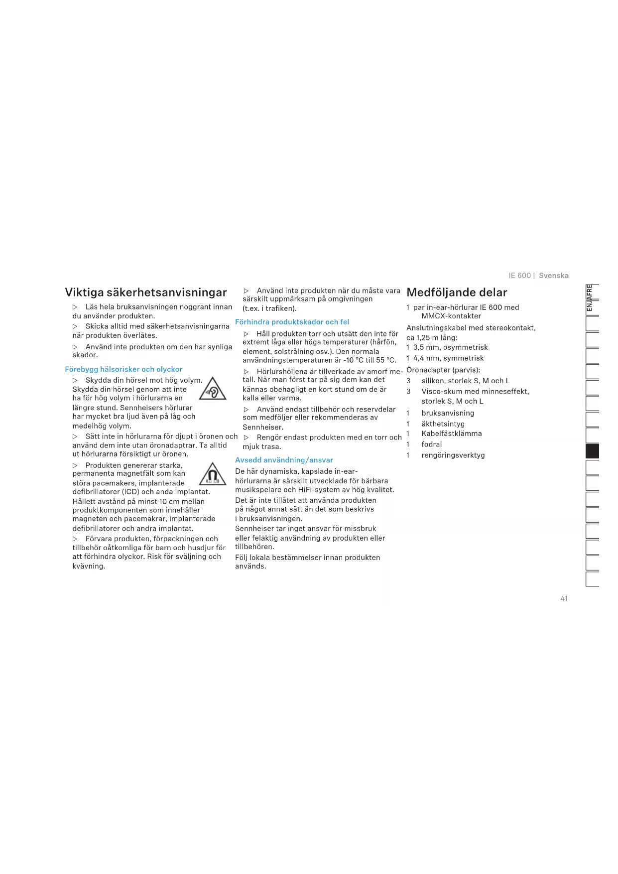 IE 600 | Svenska Viktiga säkerhetsanvisningar ▷ Läs hela bruksanvisningen noggrant innan du använder produkten. ▷ Skicka alltid med säkerhetsanvisningarna när produkten överlåtes. ▷ Använd inte produkten om den har synliga skador. Förebygg hälsorisker och olyckor ▷ Skydda din hörsel mot hög volym. Skydda din hörsel genom att inte ha för hög volym i hörlurarna en längre stund. Sennheisers hörlurar har mycket bra ljud även på låg och medelhög volym. ▷ Sätt inte in hörlurarna för djupt i öronen och använd dem inte utan öronadaptrar. Ta alltid ut hörlurarna försiktigt ur öronen. ▷ Produkten genererar starka, permanenta magnetfält som kan störa pacemakers, implanterade defibrillatorer (ICD) och anda implantat. Hållett avstånd på minst 10 cm mellan produktkomponenten som innehåller magneten och pacemakrar, implanterade defibrillatorer och andra implantat. ▷ Förvara produkten, förpackningen och tillbehör oåtkomliga för barn och husdjur för att förhindra olyckor. Risk för sväljning och kvävning. ▷ Använd inte produkten när du måste vara särskilt uppmärksam på omgivningen (t.ex. i trafiken). Förhindra produktskador och fel ▷ Håll produkten torr och utsätt den inte för extremt låga eller höga temperaturer (hårfön, element, solstrålning osv.). Den normala användningstemperaturen är -10 °C till 55 °C. ▷ Hörlurshöljena är tillverkade av amorf me- tall. När man först tar på sig dem kan det kännas obehagligt en kort stund om de är kalla eller varma. ▷ Använd endast tillbehör och reservdelar som medföljer eller rekommenderas av Sennheiser. ▷ Rengör endast produkten med en torr och mjuk trasa. Avsedd användning/ansvar De här dynamiska, kapslade in-ear- hörlurarna är särskilt utvecklade för bärbara musikspelare och HiFi-system av hög kvalitet. Det är inte tillåtet att använda produkten på något annat sätt än det som beskrivs i bruksanvisningen. Sennheiser tar inget ansvar för missbruk eller felaktig användning av produkten eller tillbehören. Följ lokala bestämmelser innan produkten används. Medföljande delar 1 par in-ear-hörlurar IE 600 med MMCX-kontakter Anslutningskabel med stereokontakt, ca 1,25 m lång: 1 3,5 mm, osymmetrisk 1 4,4 mm, symmetrisk Öronadapter (parvis): 3 silikon, storlek S, M och L 3 Visco-skum med minneseffekt, storlek S, M och L 1 bruksanvisning 1 äkthetsintyg 1 Kabelfästklämma 1 fodral 1 rengöringsverktyg42 Svenska | IE 600 Sennheiser IE 600 Återgivning av den ideala klangen – oförfalskad och klar. Det är vad IE 600 står för. Enhörlur som följer i fotspåren efter det audiofila in-ear-flaggskeppet Sennheiser IE 900. Baserat på de lovprisade TrueResponse-elementen har IE 600 resonatorkamrarna ”Dual 2 Chamber Absorber” som hjälper ljudet att ställas in i ett direkt och fokuserat utrymme. Röster placeras i förgrunden och bygger en bro mellan dig och musiken så att världen omkring dig försvinner. En neutral ljudåtergivning med ett kraftfullt lågt basområde visar vad de dynamiska 7 mm in-ear-elementen har att erbjuda med konsekvent utnyttjande av årtionden av forskning och expertis. Den balanserade återgivningen ger en ren diskant som inte spaltar upp musiken analytiskt. IE 600 visar Sennheisers passion för att återge det ideala ljudet och få dig att uppleva ett intimt personligt ögonblick med musiken. IE 600 tillverkas av ett expertteam på hörlursfabriken i Tullamore, Irland. Som för alla audiofila hörlurar gäller väldigt snäva produktionstoleranser. Alla ljudomvandlare testas fullt ut, både separat och sedan tillsammans när vänster och höger hörlurssida har sammanförts. Ljudomvandlarna för höger och vänster sida väljs ut så att de är perfekt anpassade till varandra. Ljudomvandlarna omges av ett hölje som aldrig tidigare varit tillgängligt i denna form för audiofila hörlurar. Genom selektiv lasersmältning byggdes höljet upp lager för lager i en metall med amorfa strukturer. Resultatet är ett extremt hårt material som är robust mot miljöpåverkan och som främst användes inom flyg- eller medicinteknik på grund av dess egenskaper och komplexa produktion. Dessutom är den metalliskt grova ytan av zirkonium-koppar-aluminium- nioblegeringen ett riktigt blickfång. IE 600 erbjuder utmärkt anslutning med Fidelity+ MMCX-kontakter. Dessa exakta stickkontakter har optimerats för mobil användning av hörlurarna. Genom den höga mantlingen av stickkontakterna är de filigrana kontakterna mycket väl skyddade mot mekanisk påverkan. På enheten finns som standard hankontakter med 3,5 mm och 4,4 mm. Kabeldragningen över örat med justerbara byglar garanterar att hörlurarna känns lätta att bära och ger ett minskat stomljud jämfört med standardkablar. Resultatet är att du kan njuta av timslång lyssning med dessa unika Sennheiser IE 600 hörlurar. Bilderna finns på viksidan.