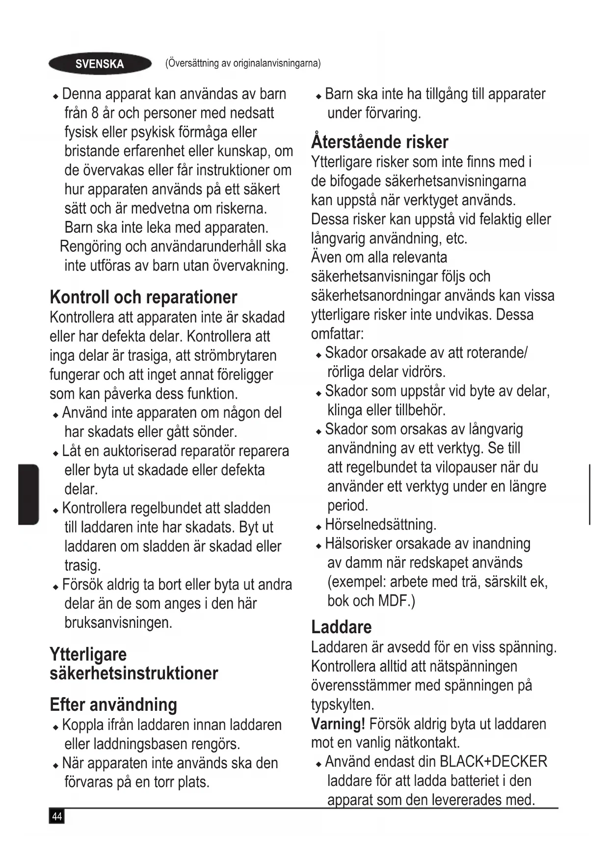 Varning! Läs alla säkerhetsvarningar och alla instruktioner. Fel som uppstår till följd av att varningarna och instruktionerna som listas nedan inte följts kan orsaka elstötar, brand och/eller allvarliga kroppsskador. u Avsedd användning beskrivs i denna manual. Använd inte apparaten med andra tillbehör eller tillsatser än de som rekommenderas i den här bruksanvisningen eftersom detta kan leda till personskador. u Spara den här bruksanvisningen för framtida referens. Använda apparaten u Använd inte apparaten för att suga upp vätskor eller material som kan fatta eld. u Använd inte apparaten i närheten av vatten. u Sänk aldrig apparaten i vatten.u Dra aldrig i sladden till laddaren när du drar ut den från vägguttaget. Håll sladden till laddaren borta från värme, olja och vassa kanter.44 (Översättning av originalanvisningarna) SVENSKA u Denna apparat kan användas av barn från 8 år och personer med nedsatt fysisk eller psykisk förmåga eller bristande erfarenhet eller kunskap, om de övervakas eller får instruktioner om hur apparaten används på ett säkert sätt och är medvetna om riskerna. Barn ska inte leka med apparaten. Rengöring och användarunderhåll ska inte utföras av barn utan övervakning. Kontroll och reparationer Kontrollera att apparaten inte är skadad eller har defekta delar. Kontrollera att inga delar är trasiga, att strömbrytaren fungerar och att inget annat föreligger som kan påverka dess funktion. u Använd inte apparaten om någon del har skadats eller gått sönder. u Låt en auktoriserad reparatör reparera eller byta ut skadade eller defekta delar. u Kontrollera regelbundet att sladden till laddaren inte har skadats. Byt ut laddaren om sladden är skadad eller trasig. u Försök aldrig ta bort eller byta ut andra delar än de som anges i den här bruksanvisningen. Ytterligare säkerhetsinstruktioner Efter användning u Koppla ifrån laddaren innan laddaren eller laddningsbasen rengörs. u När apparaten inte används ska den förvaras på en torr plats. u Barn ska inte ha tillgång till apparater under förvaring. Återstående risker Ytterligare risker som inte nns med i de bifogade säkerhetsanvisningarna kan uppstå när verktyget används. Dessa risker kan uppstå vid felaktig eller långvarig användning, etc. Även om alla relevanta säkerhetsanvisningar följs och säkerhetsanordningar används kan vissa ytterligare risker inte undvikas. Dessa omfattar: u Skador orsakade av att roterande/ rörliga delar vidrörs. u Skador som uppstår vid byte av delar, klinga eller tillbehör. u Skador som orsakas av långvarig användning av ett verktyg. Se till att regelbundet ta vilopauser när du använder ett verktyg under en längre period. u Hörselnedsättning.u Hälsorisker orsakade av inandning av damm när redskapet används (exempel: arbete med trä, särskilt ek, bok och MDF.) Laddare Laddaren är avsedd för en viss spänning. Kontrollera alltid att nätspänningen överensstämmer med spänningen på typskylten. Varning! Försök aldrig byta ut laddaren mot en vanlig nätkontakt. u Använd endast din BLACK+DECKER laddare för att ladda batteriet i den apparat som den levererades med.45 (Översättning av originalanvisningarna)SVENSKA Andra batterier kan spricka och orsaka personskador och andra skador. u Försök aldrig att ladda ej uppladdningsbara batterier. u Om nätsladden är skadad, måste den för att undvika risker, bytas ut av tillverkaren eller en auktoriserad BLACK+DECKER-verkstad. u Utsätt inte laddaren för vatten.u Öppna inte laddaren.u Gör ingen åverkan på laddaren.u Apparaten/batteriet ska placeras på en plats med god ventilation vid laddning. Elsäkerhet Symboler på laddaren