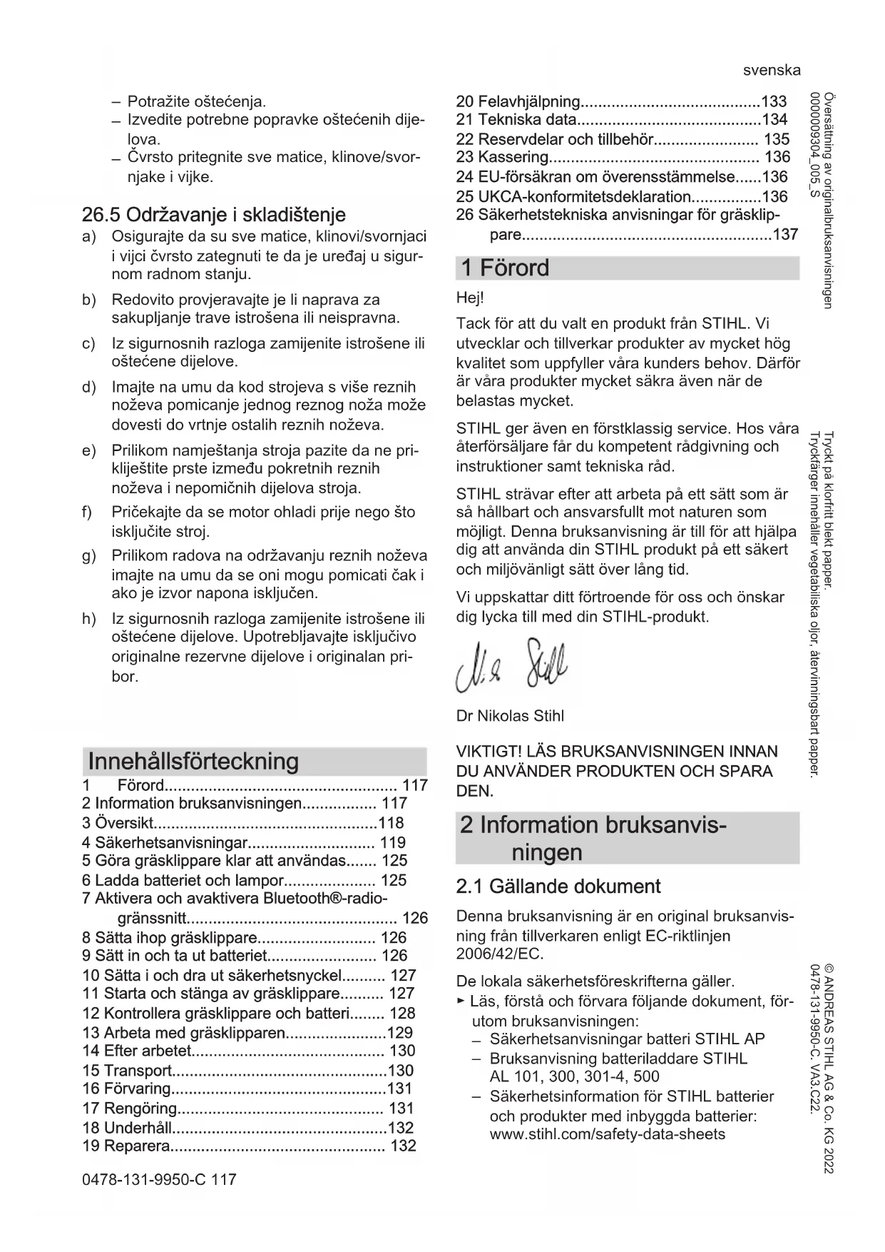 - 26 Säkerhetstekniska anvisningar för gräsklip‐ pare 1 Förord Hej! Tack för att du valt en produkt från STIHL. Vi utvecklar och tillverkar produkter av mycket hög kvalitet som uppfyller våra kunders behov. Därför är våra produkter mycket säkra även när de belastas mycket. STIHL ger även en förstklassig service. Hos våra återförsäljare får du kompetent rådgivning och instruktioner samt tekniska råd. STIHL strävar efter att arbeta på ett sätt som är så hållbart och ansvarsfullt mot naturen som möjligt. Denna bruksanvisning är till för att hjälpa dig att använda din STIHL produkt på ett säkert och miljövänligt sätt över lång tid. Vi uppskattar ditt förtroende för oss och önskar dig lycka till med din STIHL-produkt. Dr Nikolas Stihl p. 137
