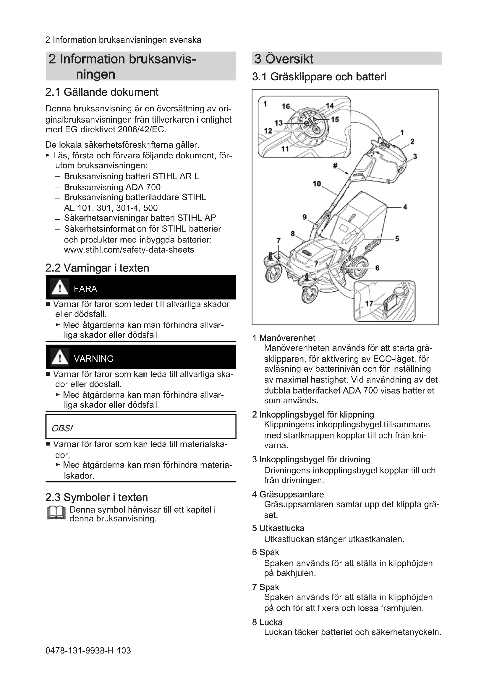 1 Manöverenhet Manöverenheten används för att starta grä‐ sklipparen, för aktivering av ECO-läget, för avläsning av batterinivån och för inställning av maximal hastighet. Vid användning av det dubbla batterifacket ADA 700 visas batteriet som används. 2 Inkopplingsbygel för klippning Klippningens inkopplingsbygel tillsammans med startknappen kopplar till och från kni‐ varna. 3 Inkopplingsbygel för drivning Drivningens inkopplingsbygel kopplar till och från drivningen. 4 Gräsuppsamlare Gräsuppsamlaren samlar upp det klippta grä‐ set. 5 Utkastlucka Utkastluckan stänger utkastkanalen. 6 Spak Spaken används för att ställa in klipphöjden på bakhjulen. 7 Spak Spaken används för att ställa in klipphöjden på och för att fixera och lossa framhjulen. 8 Lucka Luckan täcker batteriet och säkerhetsnyckeln. 2 Information bruksanvisningen svenska 0478-131-9938-H 1039 Spak Spaken används för att ställa in och fälla ned styrhandtaget. 10 Styrhandtag Styrhandtaget används för att hålla, styra och transportera gräsklipparen. 11 Ratt Ratten används för att ställa in maximal has‐ tighet. 12 Startknapp Startknappen aktiverar gräsklipparen och kopplar till knivarna tillsammans med klipp‐ ningens inkopplingsbygel. 13 ECO-strömbrytare ECO-strömbrytaren startar och stänger av ECO-läget. 14 Visa laddningstillstånd LED-lamporna visar batteriets laddningstill‐ stånd och störningar när startknappen trycks. 15 Varningstriangel Varningstriangeln visar störningar på gräsklip‐ paren. 16 Indikering för dubbelt batterifack ADA 700 LED-lamporna visar batteriet som används för tillfället. 17 Säkerhetsnyckel Säkerhetsnyckeln aktiverar gräsklipparen. # Typskylt med maskinnummer
