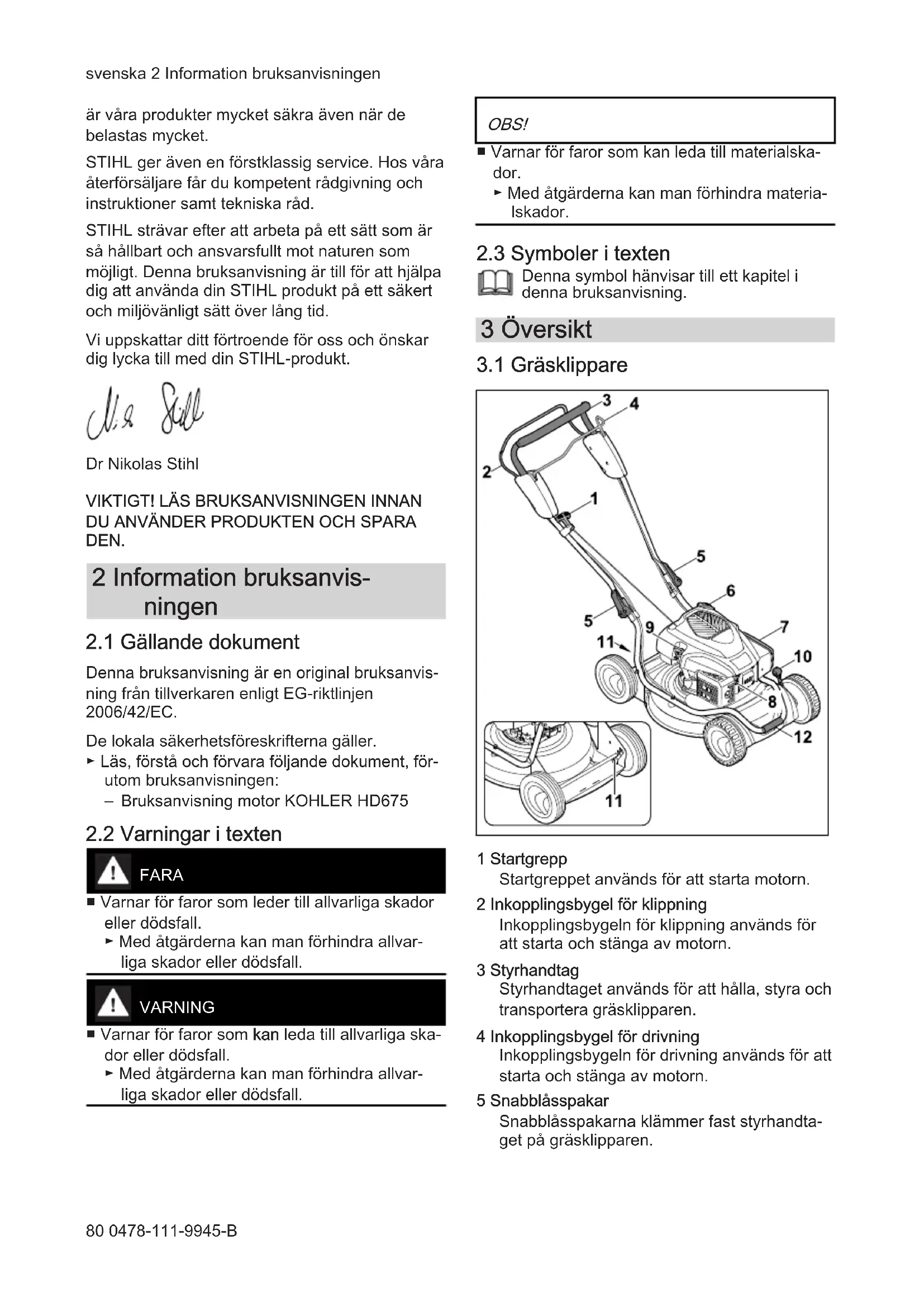 STIHL strävar after att arbeta på ett satt som är söhlbart och ansvarsfullt mot naturen som möjligt. Denna brupsanvisning är till for att hjälpa dig att använda din STIHL produit på ett sakert och miljövänligt sätt over läng tid.