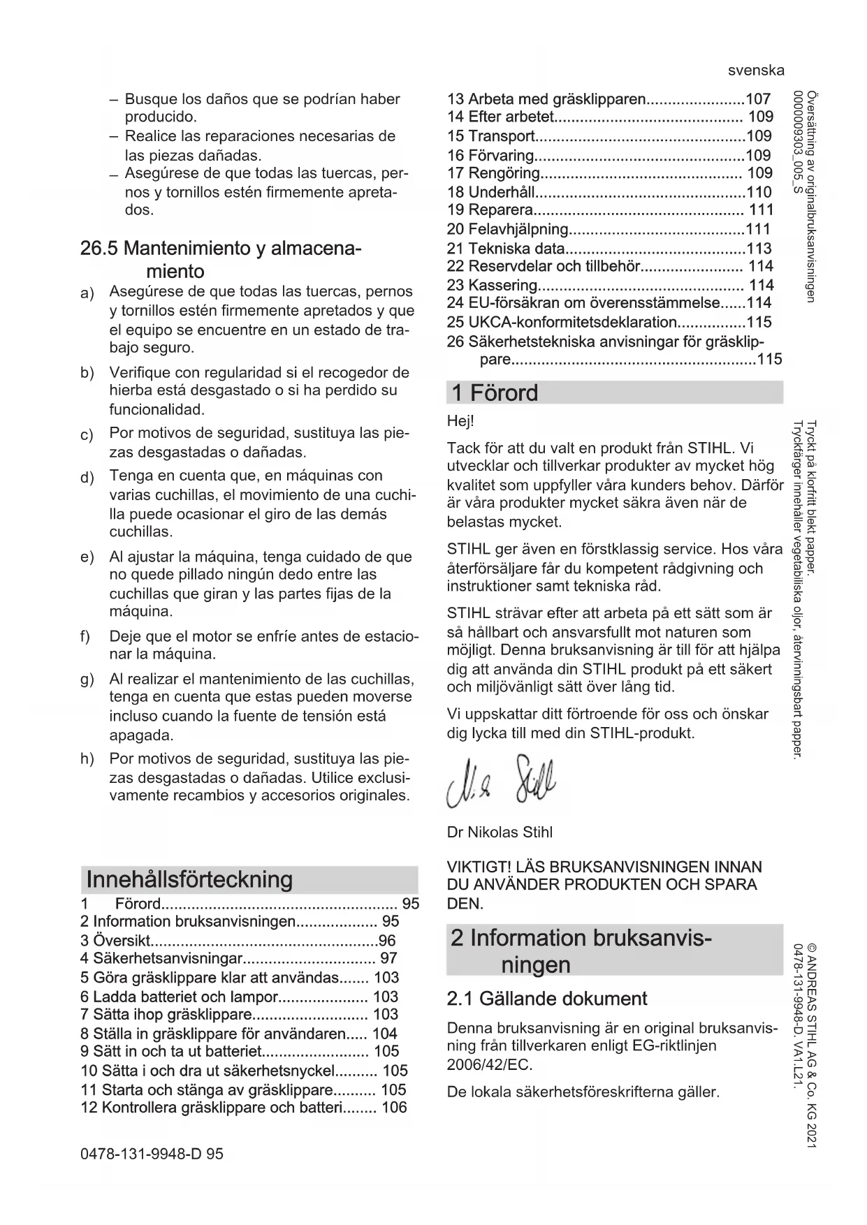 Denna bruksanvisning är en original bruksanvis‐ ning från tillverkaren enligt EG-riktlinjen 2006/42/EC. De lokala säkerhetsföreskrifterna gäller. svenska 0478-131-9948-D 95 © ANDREAS STIHL AG & Co. KG 2021 0478-131-9948-D. VA1.L21. Tryckt på klorfritt blekt papper. Tryckfärger innehåller vegetabiliska oljor, återvinningsbart papper. Översättning av originalbruksanvisningen 0000009303_005_S► Läs, förstå och förvara följande dokument, för‐ utom bruksanvisningen: