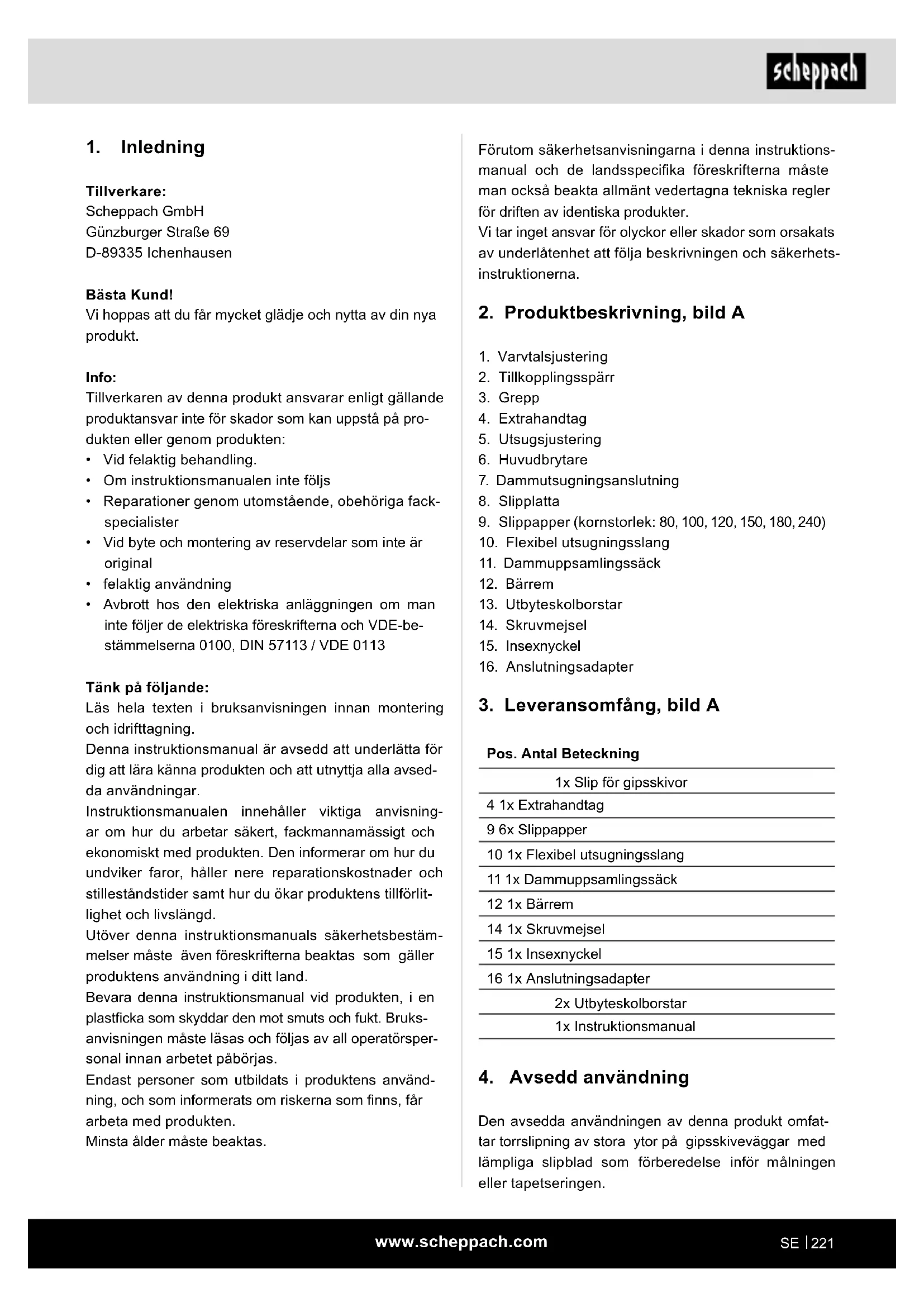 Tillverkare: Scheppach GmbH Günzburger Straße 69 D-89335 Ichenhausen Bästa Kund! Vi hoppas att du får mycket glädje och nytta av din nya produkt. Info: Tillverkaren av denna produkt ansvarar enligt gällande produktansvar inte för skador som kan uppstå på pro- dukten eller genom produkten: