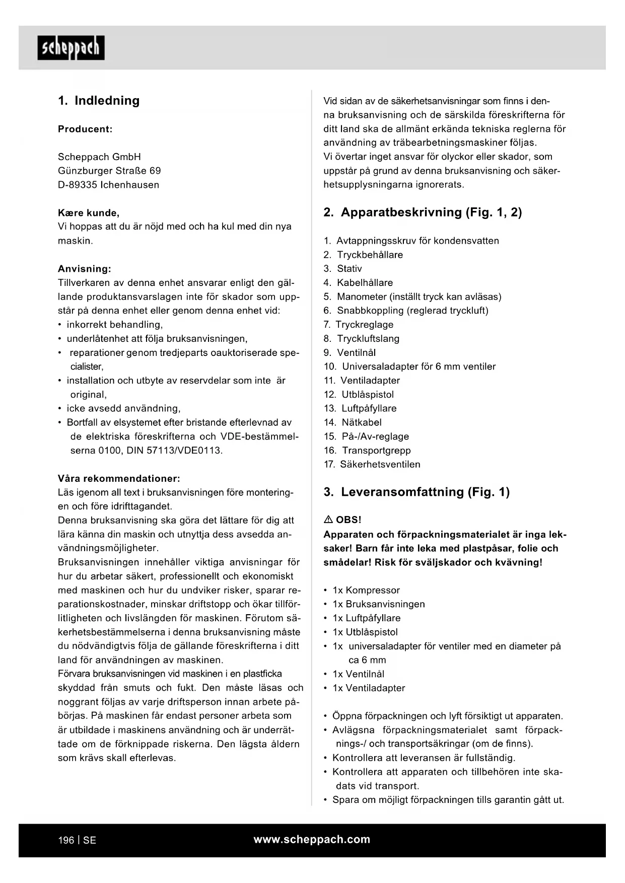Producent: Scheppach GmbH Günzburger Straße 69 D-89335 Ichenhausen Kære kunde, Vi hoppas att du är nöjd med och ha kul med din nya maskin. Anvisning: Tillverkaren av denna enhet ansvarar enligt den gäl- lande produktansvarslagen inte för skador som upp- står på denna enhet eller genom denna enhet vid: