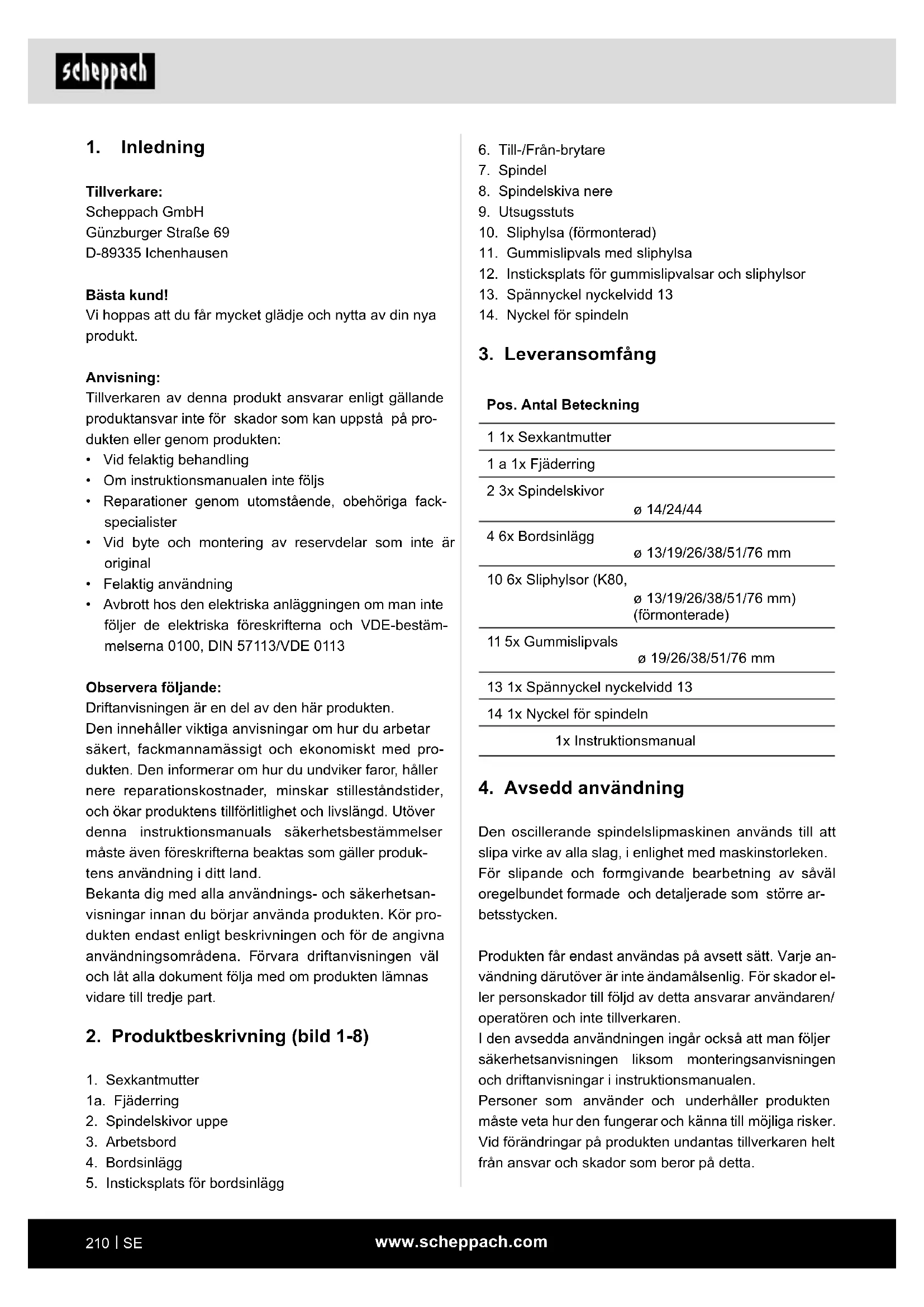 Tillverkare: Scheppach GmbH Günzburger Straße 69 D-89335 Ichenhausen Bästa kund! Vi hoppas att du får mycket glädje och nytta av din nya produkt. Anvisning: Tillverkaren av denna produkt ansvarar enligt gällande produktansvar inte för skador som kan uppstå på pro- dukten eller genom produkten: