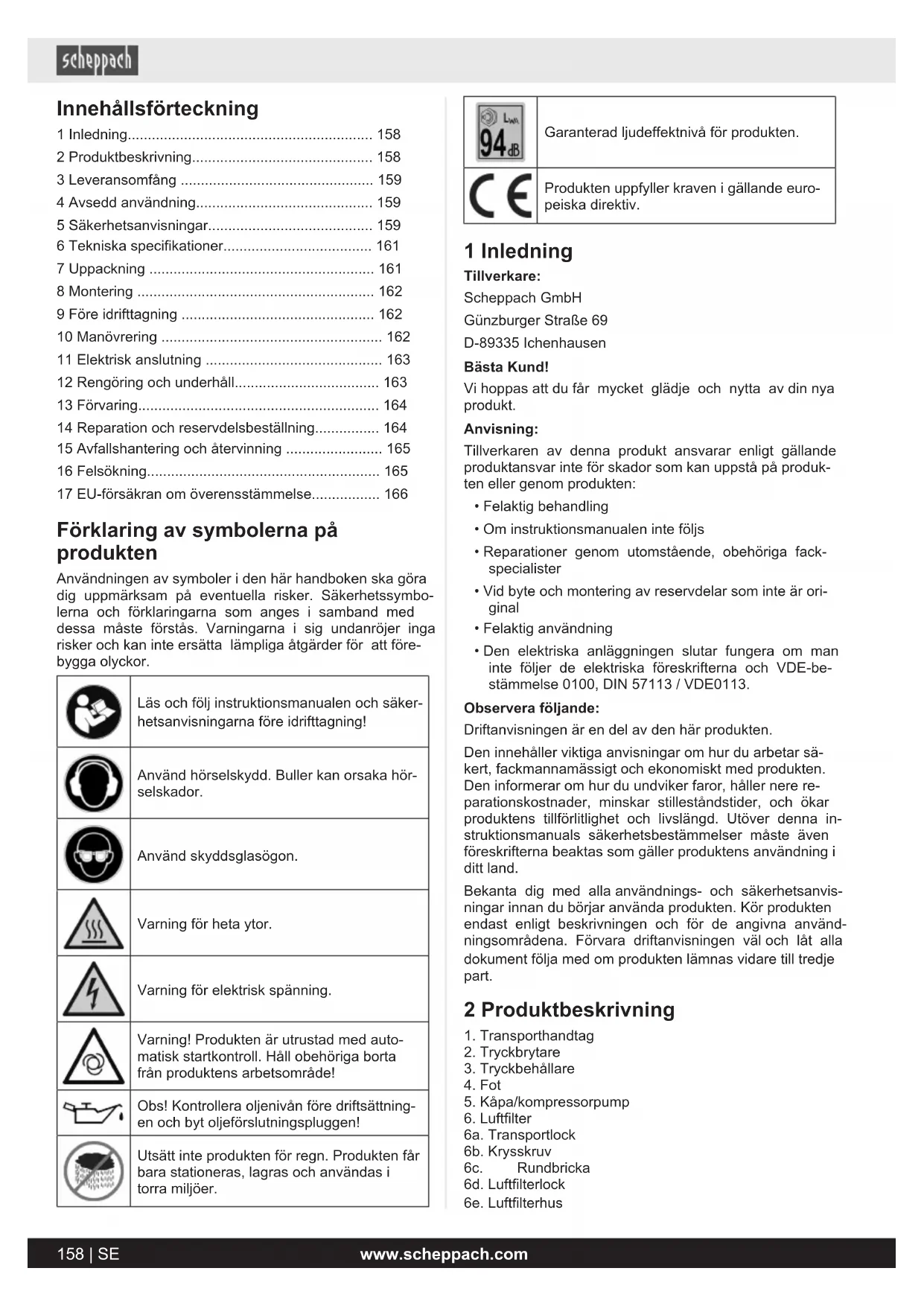 kompressorer OBS När du använder denna kompressor är det nödvändigt att du iakttar följande grundläggande säkerhetsåtgärder för att skydda dig mot elektriska stötar, skador eller brandfara. Läs och beakta dessa anvisningar innan du använder produkten. SE | 159www.scheppach.comSäkert arbete