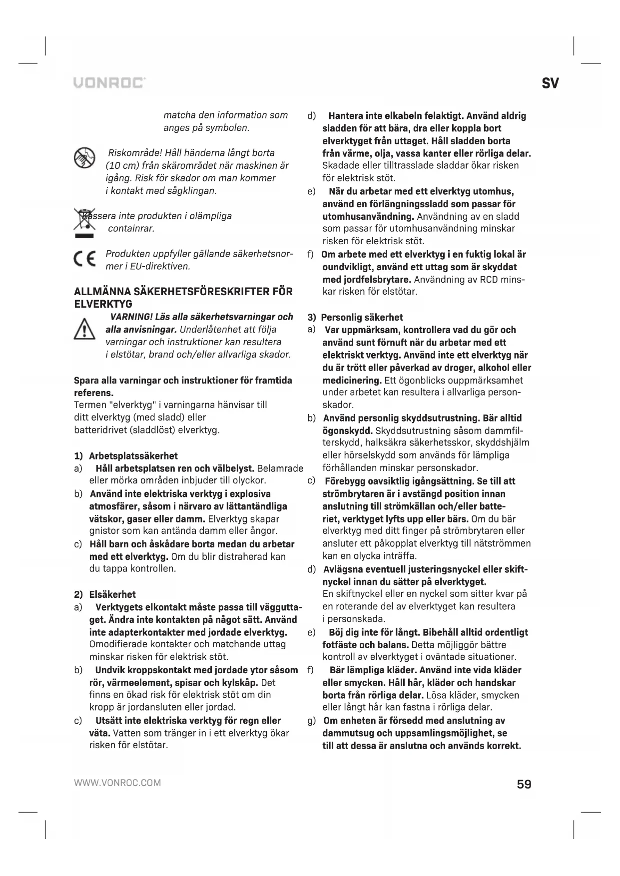 VONROC-produkter ar utvecklade enigt hogsta kvalitetsstandard och garanteras fria fran defekter i bade material och utforande under den period som lagen foreskriver fran och med inkopsdatumet. Omprodukten skulle utveckla fel under denna period på grund av defekt material och/eller utforande, kontakta d'a VONROC direkt.