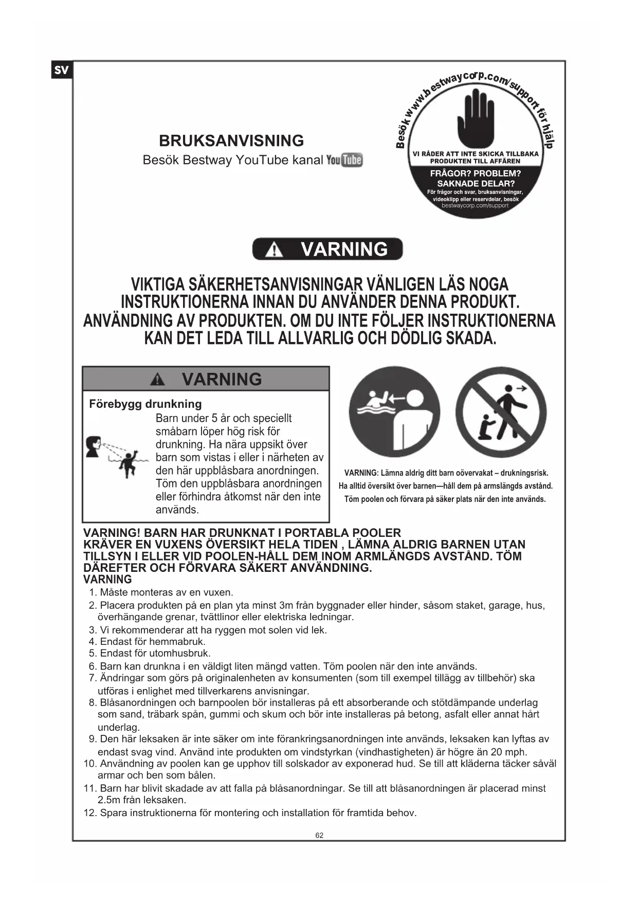 JAVÍTÓTAPASZRA VONATKOZÓ UTASÍTÁSOK 61Besök Bestway YouTube kanal BRUKSANVISNING VI RÅDER ATT INTE SKICKA TILLBAKAPRODUKTEN TILL AFFÄRENFRÅGOR? PROBLEM?SAKNADE DELAR?För frågor och svar, bruksanvisningar,videoklipp eller reservdelar, besökbestwaycorp.com/support