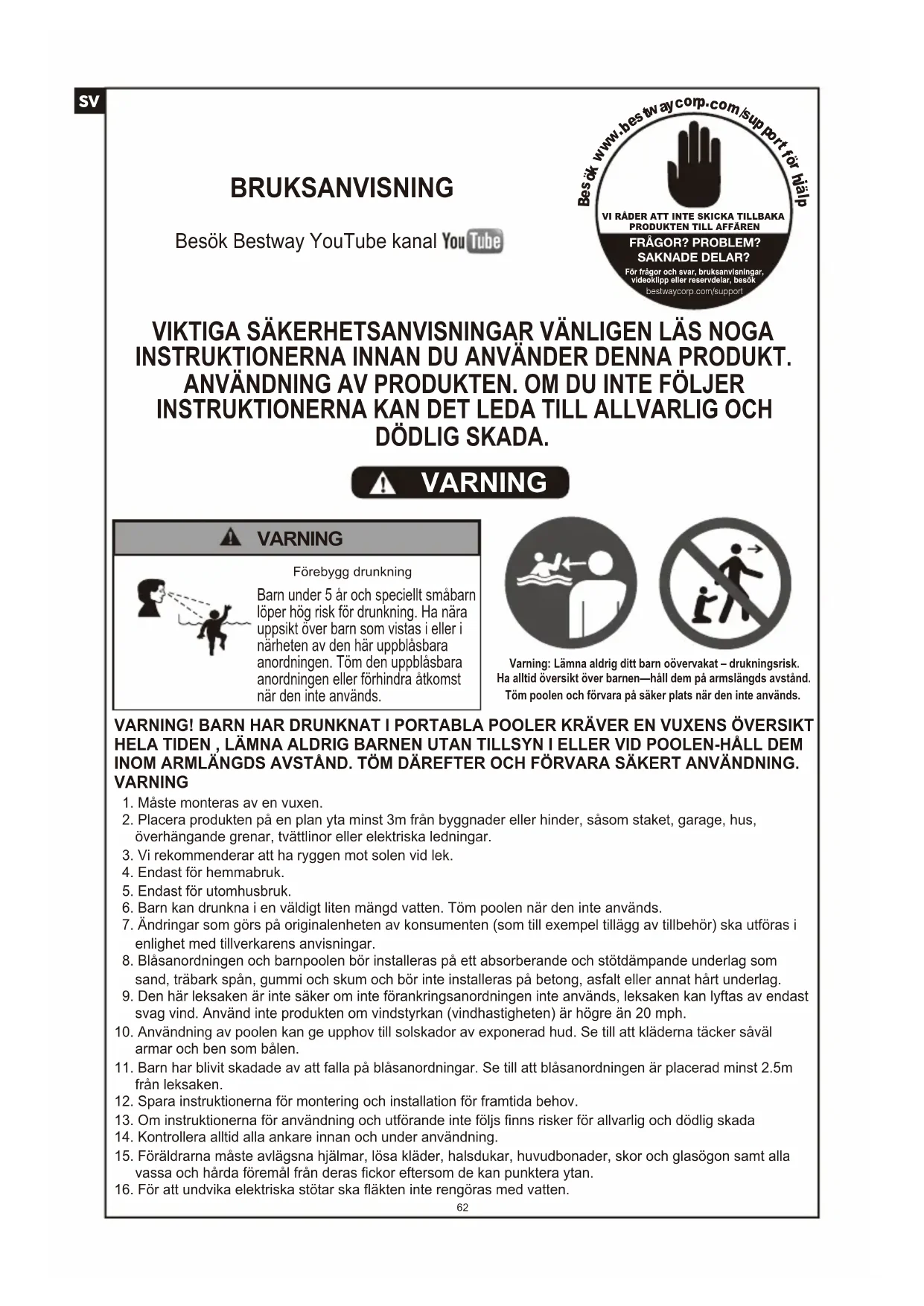 VIKTIGA SÄKERHETSANVISNINGAR VÄNLIGEN LÄS NOGA INSTRUKTIONERNA INNAN DU ANVÄNDER DENNA PRODUKT. ANVÄNDNING AV PRODUKTEN. OM DU INTE FÖLJER INSTRUKTIONERNA KAN DET LEDA TILL ALLVARLIG OCH DÖDLIG SKADA. VARNING Varning: Lämna aldrig ditt barn oövervakat – drukningsrisk.Ha alltid översikt över barnen—håll dem på armslängds avstånd.Töm poolen och förvara på säker plats när den inte används.Förebygg drunkning VARNING Barn under 5 år och speciellt småbarn löper hög risk för drunkning. Ha nära uppsikt över barn som vistas i eller i närheten av den här uppblåsbara anordningen. Töm den uppblåsbara anordningen eller förhindra åtkomst när den inte används. VARNING! BARN HAR DRUNKNAT I PORTABLA POOLER KRÄVER EN VUXENS ÖVERSIKT HELA TIDEN , LÄMNA ALDRIG BARNEN UTAN TILLSYN I ELLER VID POOLEN-HÅLL DEM INOM ARMLÄNGDS AVSTÅND. TÖM DÄREFTER OCH FÖRVARA SÄKERT ANVÄNDNING. VARNING 1. Måste monteras av en vuxen. 2. Placera produkten på en plan yta minst 3m från byggnader eller hinder, såsom staket, garage, hus, överhängande grenar, tvättlinor eller elektriska ledningar. 3. Vi rekommenderar att ha ryggen mot solen vid lek. 4. Endast för hemmabruk. 5. Endast för utomhusbruk. 6. Barn kan drunkna i en väldigt liten mängd vatten. Töm poolen när den inte används. 7. Ändringar som görs på originalenheten av konsumenten (som till exempel tillägg av tillbehör) ska utföras i enlighet med tillverkarens anvisningar. 8. Blåsanordningen och barnpoolen bör installeras på ett absorberande och stötdämpande underlag som sand, träbark spån, gummi och skum och bör inte installeras på betong, asfalt eller annat hårt underlag. 9. Den här leksaken är inte säker om inte förankringsanordningen inte används, leksaken kan lyftas av endast svag vind. Använd inte produkten om vindstyrkan (vindhastigheten) är högre än 20 mph.10. Användning av poolen kan ge upphov till solskador av exponerad hud. Se till att kläderna täcker såväl armar och ben som bålen.11. Barn har blivit skadade av att falla på blåsanordningar. Se till att blåsanordningen är placerad minst 2.5m från leksaken.12. Spara instruktionerna för montering och installation för framtida behov.13. Om instruktionerna för användning och utförande inte följs finns risker för allvarlig och dödlig skada14. Kontrollera alltid alla ankare innan och under användning.15. Föräldrarna måste avlägsna hjälmar, lösa kläder, halsdukar, huvudbonader, skor och glasögon samt alla vassa och hårda föremål från deras fickor eftersom de kan punktera ytan.16. För att undvika elektriska stötar ska fläkten inte rengöras med vatten.17. Använd inte förlängningssladd till den här produkten.