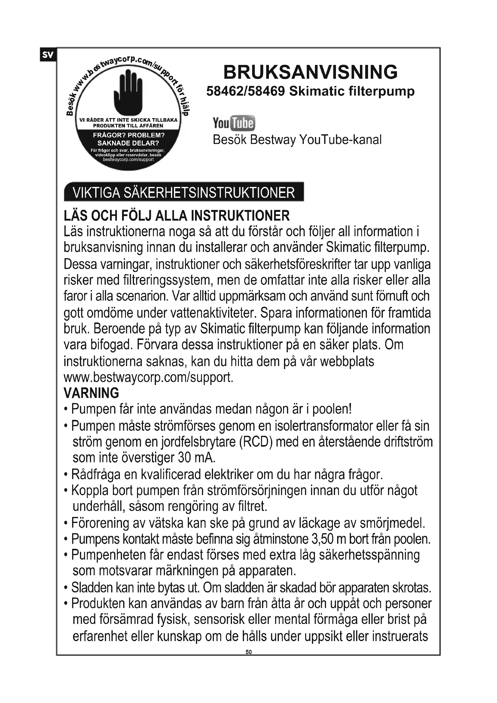 pAVFALLSHANTERING LÄS OCH FÖLJ ALLA INSTRUKTIONER Läs instruktionerna noga så att du förstår och följer all information i bruksanvisning innan du installerar och använder Skimatic filterpump. Dessa varningar, instruktioner och säkerhetsföreskrifter tar upp vanliga risker med filtreringssystem, men de omfattar inte alla risker eller alla faror i alla scenarion. Var alltid uppmärksam och använd sunt förnuft och gott omdöme under vattenaktiviteter. Spara informationen för framtida bruk. Beroende på typ av Skimatic filterpump kan följande information vara bifogad. Förvara dessa instruktioner på en säker plats. Om instruktionerna saknas, kan du hitta dem på vår webbplats www.bestwaycorp.com/support. VARNING