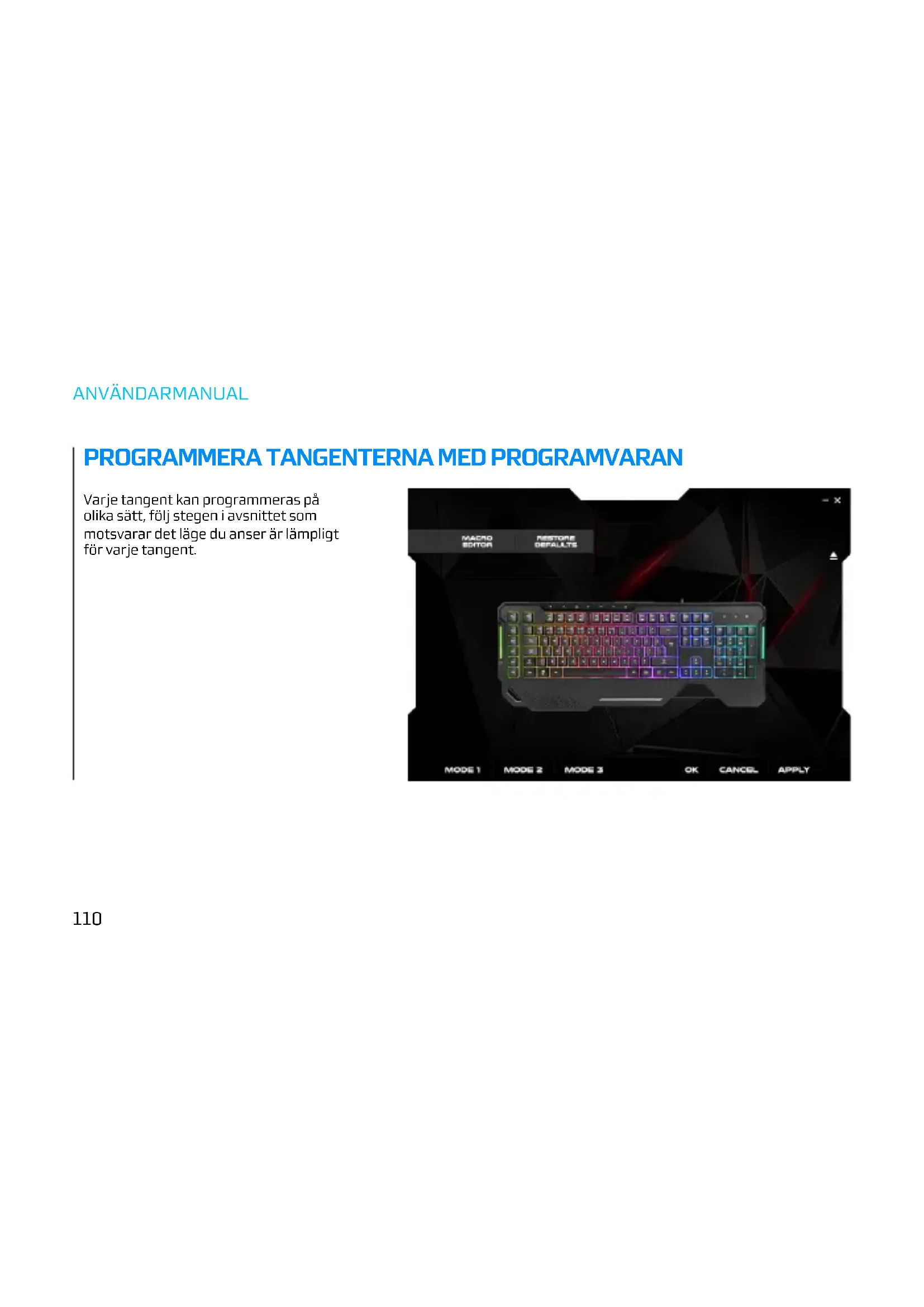 Varje tangent kan programmeras på olika sätt, följ stegen i avsnittet som motsvarar det läge du anser är lämpligt för varje tangent.111 SVENSKA ENSKILD TANGENT Välj den tangent som du vill ändra den aktuella tangenten för, tryck på OK och spara dess inställningar.112 ANVÄNDARMANUAL MAKROINSTÄLLNING Välj en tangent som har ändrats eller skapa en ny. Tryck på M1, sedan på REC och tryck på önskad makroknapp som du vill spara. Tryck slutligen på REC för att avsluta inställningen Obs: LED-lamporna blinkar113 SVENSKA MULTIMEDIA Välj bland alternativen som visas i rullgardinsmenyn, tryck på OK och spara inställningarna.114 ANVÄNDARMANUAL FUNKTION Välj bland alternativen som visas i rullgardinsmenyn, tryck på OK och spara inställningarna.115 SVENSKA Vadderade specialtangenter för spel 104 bakgrundsbelysta tangenter 19 multimediatangenter 5 makrotangenter RVB-belysning med upp till 16,8 miljoner färger Handledsstöd Tvinnad kabel på 1,8 m ± 10 % Kompatibel med videospelkonsoler via USB-port TEKNISKA SPECIFIKATIONER Om du vid något framtida tillfälle skulle vilja kassera produkten, vänligen notera att: Elektriskt avfall bör ej kasseras tillsammans med hushållsavfall. Vänligen använd återvinningsstation för detta. Du kan vända dig till ditt lokala ombud eller återförsäljare för att få råd om återvinning. (Råd gällande elektriskt avfall och elektronisk utrustning)116 BRUGERVEJLEDNING