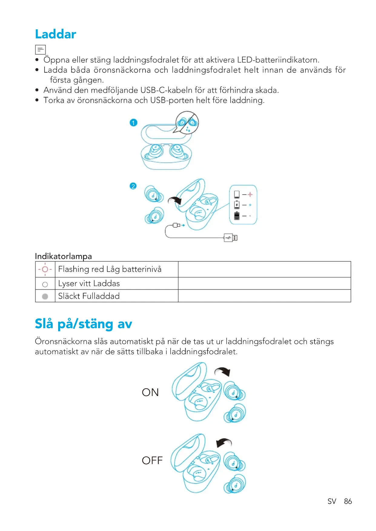 Indikatorlampa Flashing red Låg batterinivå Lyser vitt Laddas Släckt Fulladdad Slå på/stäng av Öronsnäckorna slås automatiskt på när de tas ut ur laddningsfodralet och stängs automatiskt av när de sätts tillbaka i laddningsfodralet.
