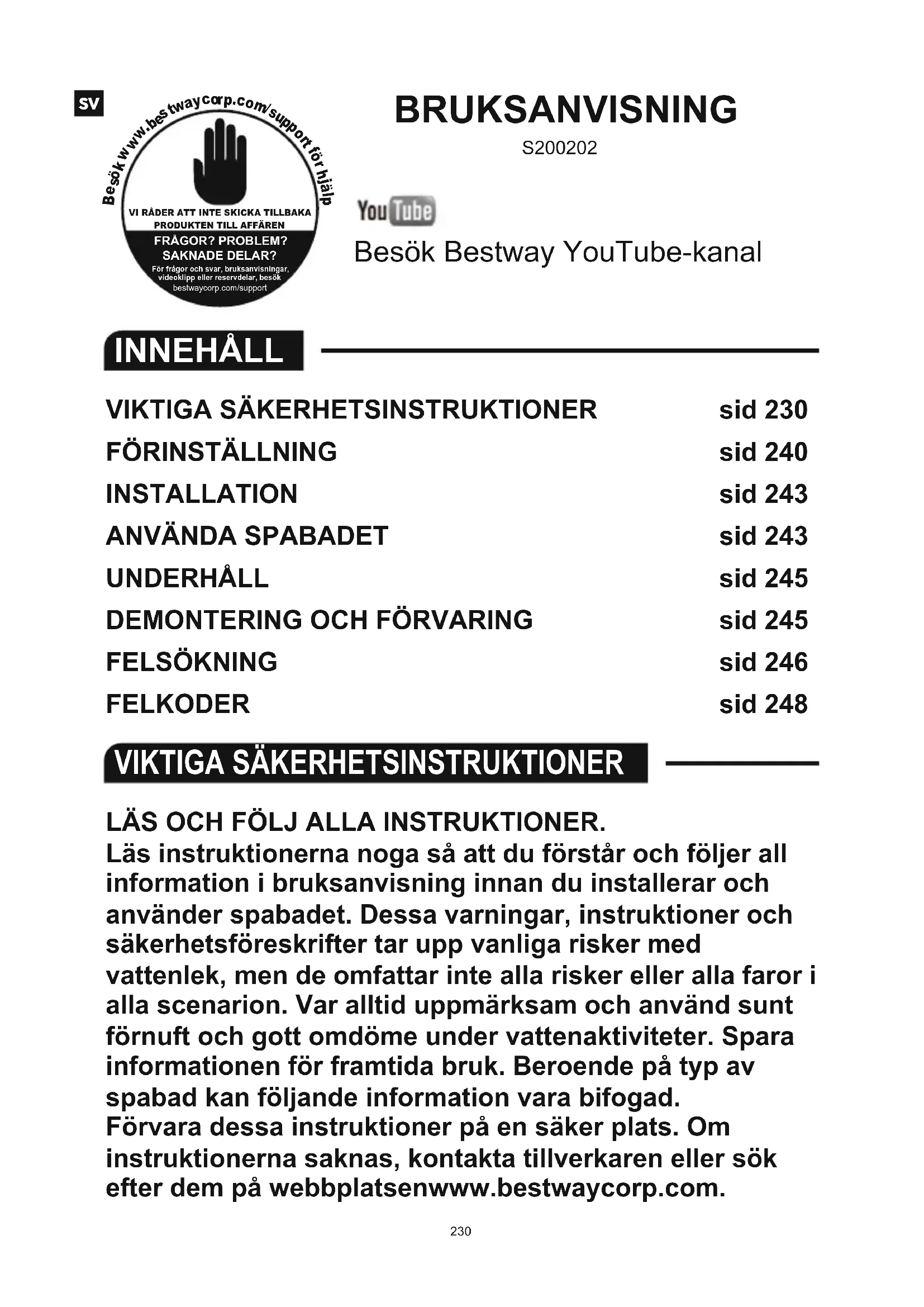 S200202LÄS OCH FÖLJ ALLA INSTRUKTIONER. Läs instruktionerna noga så att du förstår och följer all information i bruksanvisning innan du installerar och använder spabadet. Dessa varningar, instruktioner och säkerhetsföreskrifter tar upp vanliga risker med vattenlek, men de omfattar inte alla risker eller alla faror i alla scenarion. Var alltid uppmärksam och använd sunt förnuft och gott omdöme under vattenaktiviteter. Spara informationen för framtida bruk. Beroende på typ av spabad kan följande information vara bifogad. Förvara dessa instruktioner på en säker plats. Om instruktionerna saknas, kontakta tillverkaren eller sök efter dem på webbplatsenwww.bestwaycorp.com.