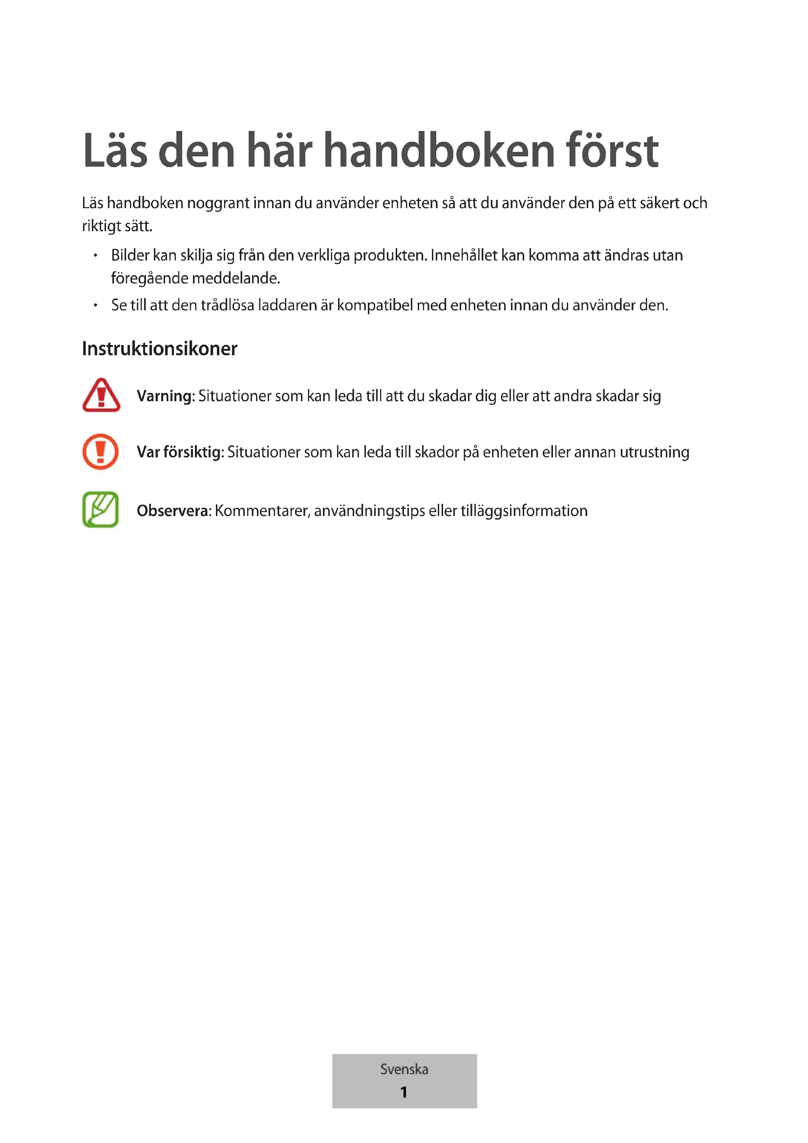 Se till att den trådlösa laddaren är kompatibel med enheten innan du använder den. Instruktionsikoner Varning: Situationer som kan leda till att du skadar dig eller att andra skadar sig Var försiktig: Situationer som kan leda till skador på enheten eller annan utrustning Observera: Kommentarer, användningstips eller tilläggsinformation Svenska
