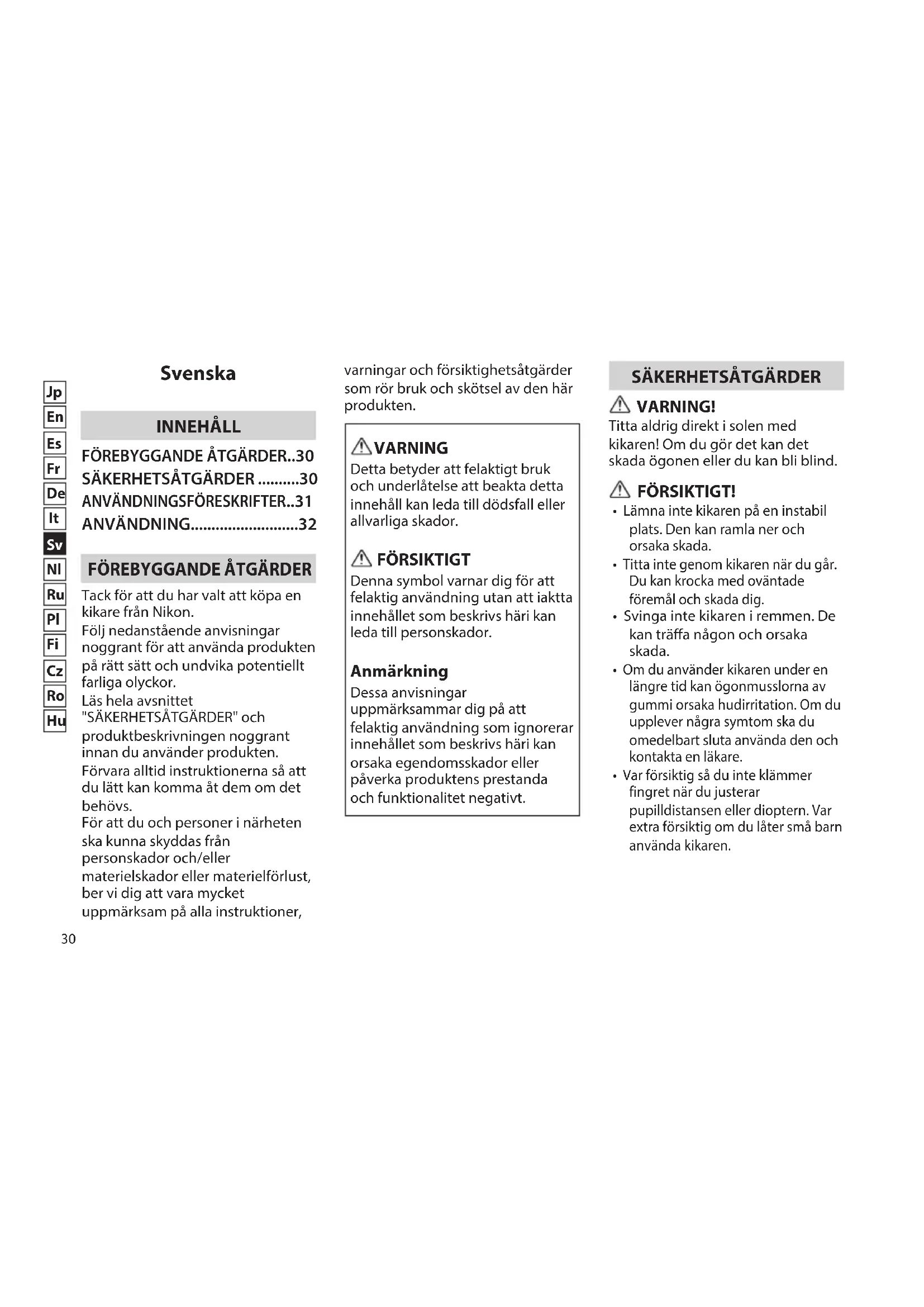 Tack for att du har valt att kopa en kikare fran Nikon. Folj nedanstende anvisningar noggrant for att anzenda Produkten pa ratt satt och undvika potentiellt farlga olyckor. Lås hela avsnittet "SAKERHETSATGARDER" och produktbeskrivningen noggrant innan du anvander Produkten. Forvara alltid instruktionerna sa att du latt kan komma at dem om det behovs. For att du och personer i narheten ske kunna skyddas frans personskador och/eller materielskador eller materielforlust, ber vi dig att vara mycket uppmarksam palla instruktioner,