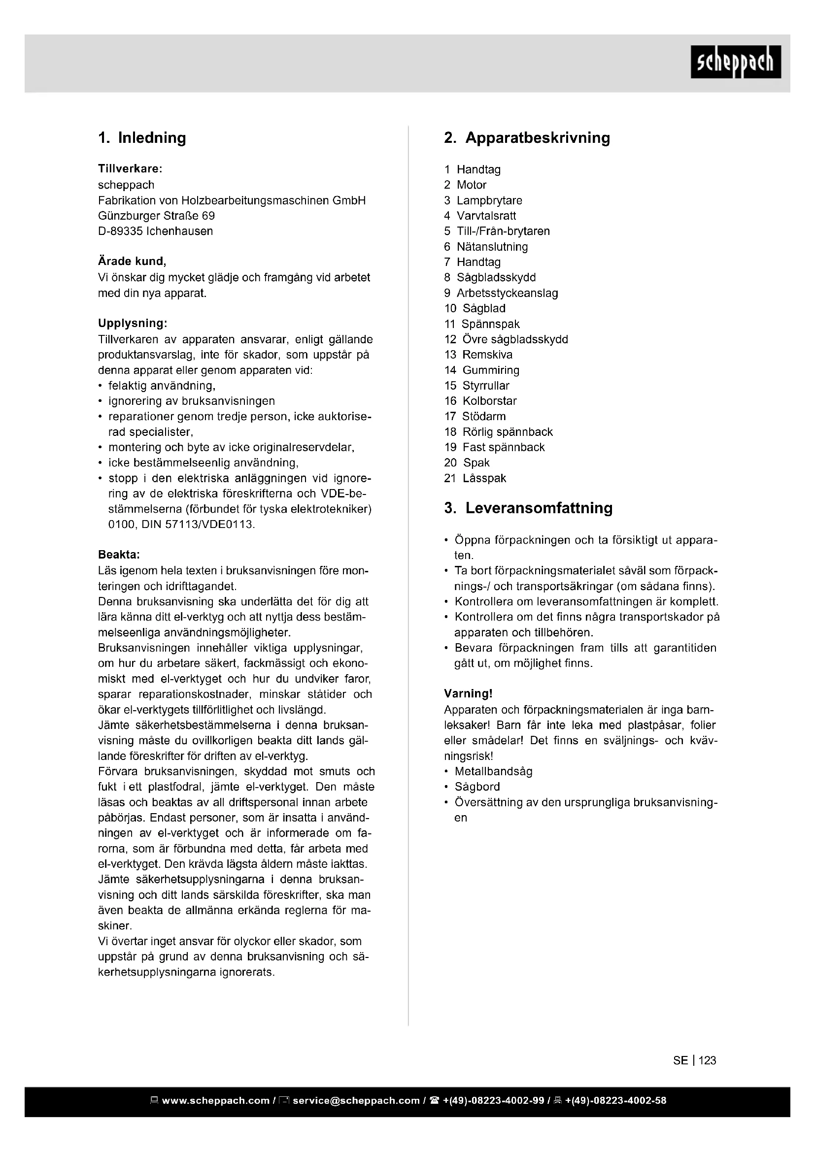- Var alltid uppmärksam, framför allt vid återkom- mande, monotona arbetsprocedurer. Tänk alltid på att hålla händerna på rätt ställe i förhållande till sågbladet. www.scheppach.com / service@scheppach.com / +(49)-08223-4002-99 / +(49)-08223-4002-58