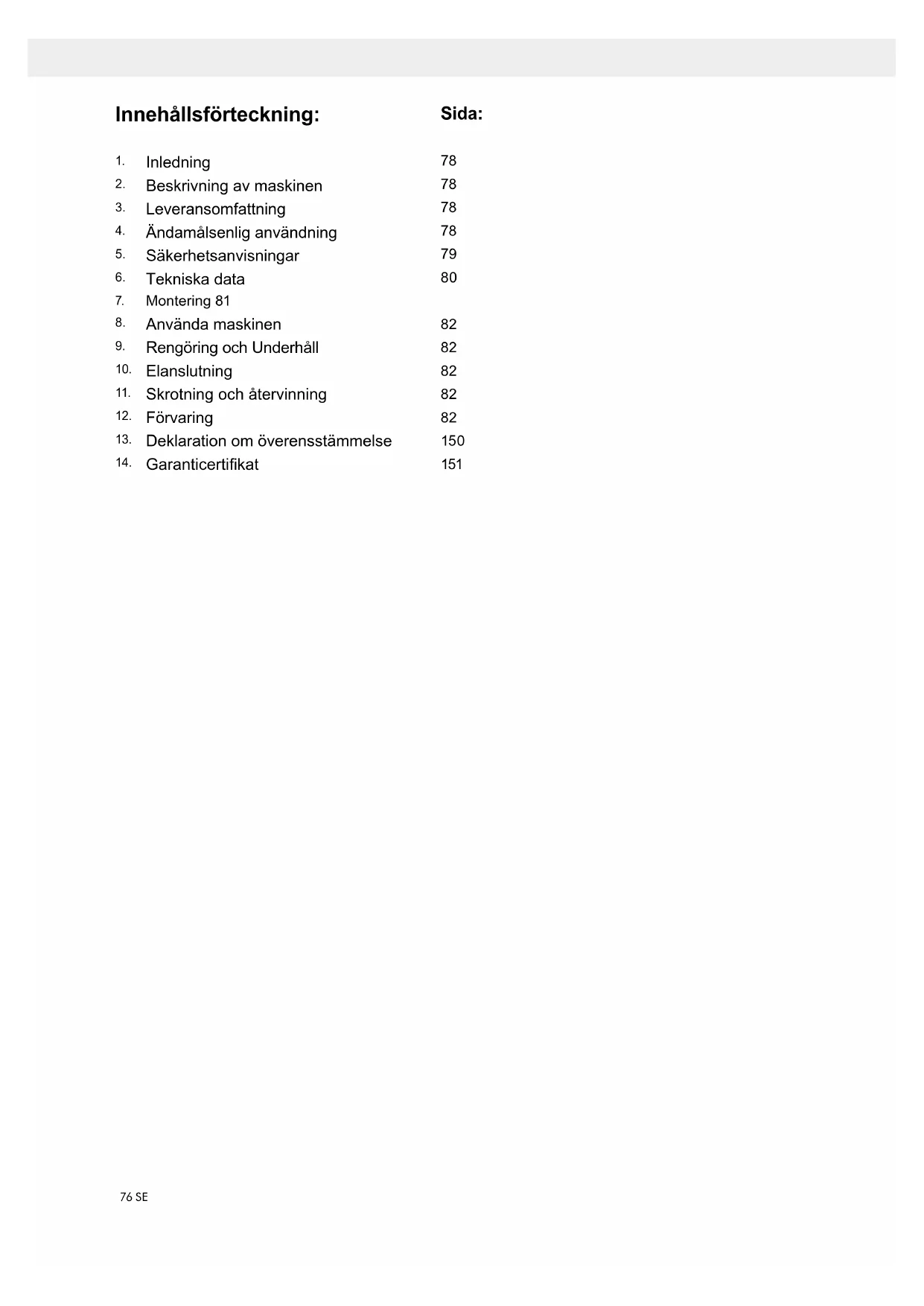 - Maskinen får endast användas till sitt avsedda än- damål. Användningar som sträcker sig utöver detta användningsområde är ej ändamålsenliga. För materi- alskador eller personskador som resulterar av sådan användning ansvarar användaren/ operatören själv. Tillverkaren påtar sig inget ansvar.79SE
