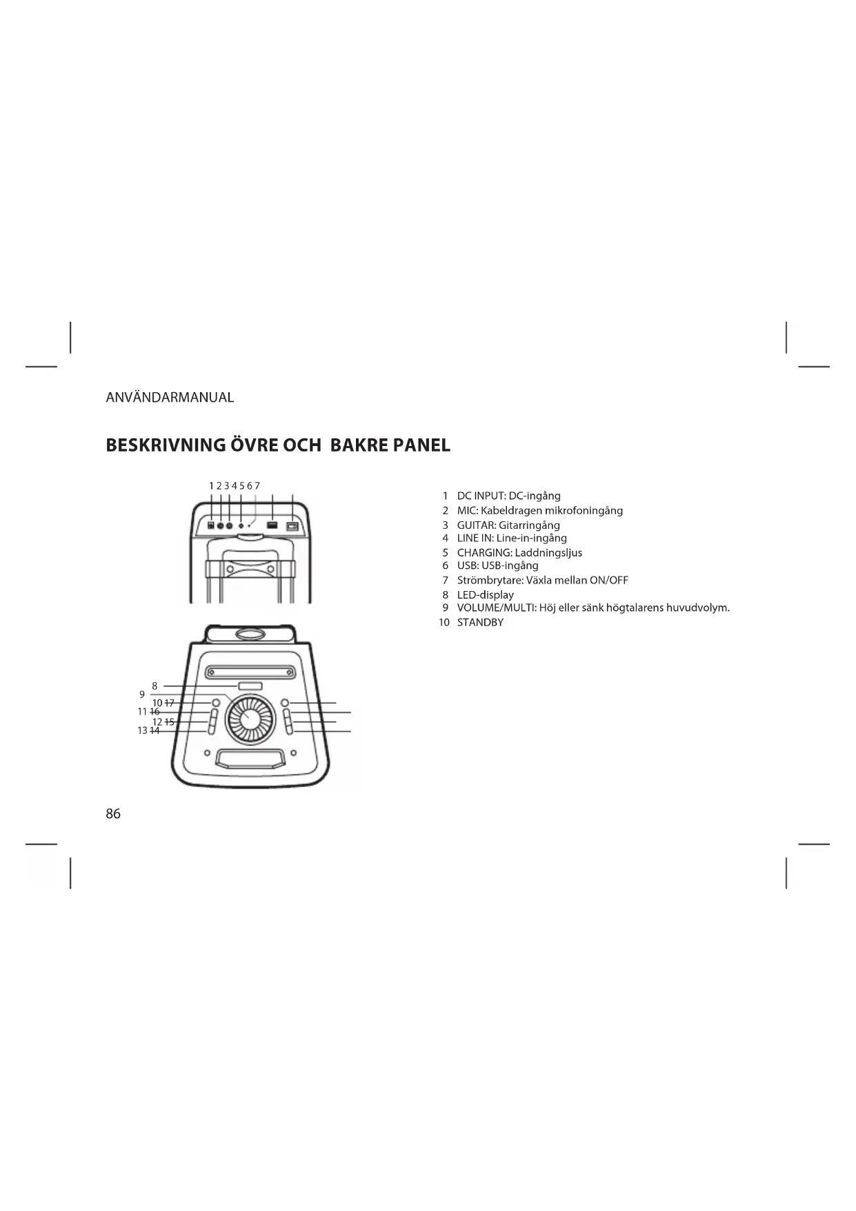 DC INPUT: DC-ingång MIC: Kabeldragen mikrofoningång GUITAR: Gitarringång LINE IN: Line-in-ingång CHARGING: Laddningsljus USB: USB-ingång Strömbrytare: Växla mellan ON/OFF LED-display VOLUME/MULTI: Höj eller sänk högtalarens huvudvolym. STANDBY