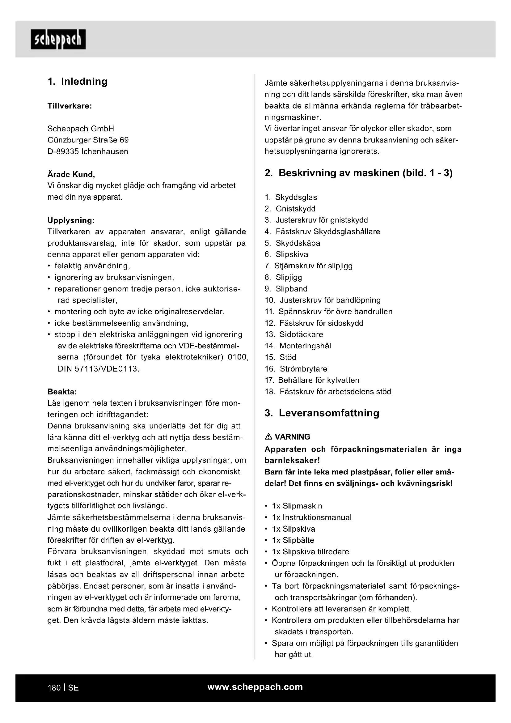 - stopp i den elektriska anläggningen vid ignorering av de elektriska föreskrifterna och VDE-bestämmel- serna (förbundet för tyska elektrotekniker) 0100, DIN 57113/VDE0113. Beakta: Läs igenom hela texten i bruksanvisningen före mon- teringen och idrifttagandet: Denna bruksanvisning ska underlätta det för dig att lära känna ditt el-verktyg och att nyttja dess bestäm- melseenliga användningsmöjligheter. Bruksanvisningen innehåller viktiga upplysningar, om hur du arbetare säkert, fackmässigt och ekonomiskt med el-verktyget och hur du undviker faror, sparar re- parationskostnader, minskar ståtider och ökar el-verk- tygets tillförlitlighet och livslängd. Jämte säkerhetsbestämmelserna i denna bruksanvis- ning måste du ovillkorligen beakta ditt lands gällande föreskrifter för driften av el-verktyg. Förvara bruksanvisningen, skyddad mot smuts och fukt i ett plastfodral, jämte el-verktyget. Den måste läsas och beaktas av all driftspersonal innan arbete påbörjas. Endast personer, som är insatta i använd- ningen av el-verktyget och är informerade om farorna, som är förbundna med detta, får arbeta med el-verkty- get. Den krävda lägsta åldern måste iakttas.www.scheppach.com
