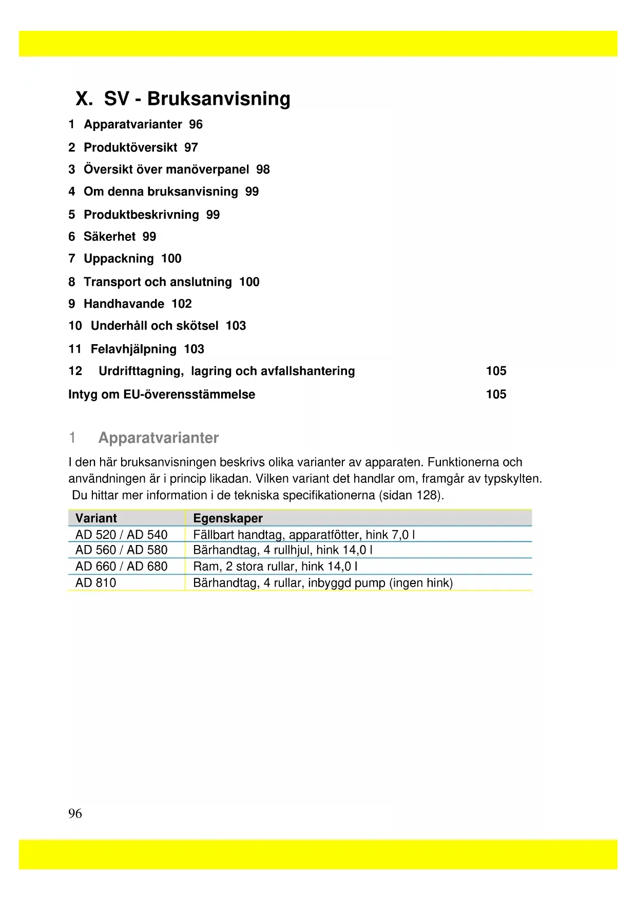 1 Apparatvarianter 96 2 Produktöversikt 97 3 Översikt över manöverpanel 98 4 Om denna bruksanvisning 99 5 Produktbeskrivning 99 6 Säkerhet 99 7 Uppackning 100 8 Transport och anslutning 100 9 Handhavande 102 10 Underhåll och skötsel 103 11 Felavhjälpning 103 12 Urdrifttagning, lagring och avfallshantering 105 Intyg om EU-överensstämmelse 105 1 Apparatvarianter I den här bruksanvisningen beskrivs olika varianter av apparaten. Funktionerna och användningen är i princip likadan. Vilken variant det handlar om, framgår av typskylten. Du hittar mer information i de tekniska specifikationerna (sidan 128). Variant Egenskaper AD 520 / AD 540 Fällbart handtag, apparatfötter, hink 7,0 l AD 560 / AD 580 Bärhandtag, 4 rullhjul, hink 14,0 l AD 660 / AD 680 Ram, 2 stora rullar, hink 14,0 l AD 810 Bärhandtag, 4 rullar, inbyggd pump (ingen hink)97 2 Produktöversikt