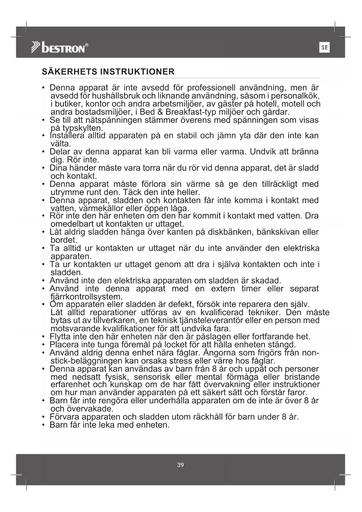 - Denna apparat kan användas av barn fran 8 År och uppåt och personen med nedsatt fysisk, sensorisk eller mental formåga eller bristande erfarenhet och kunskap om de har fätt overvakning eller instruktionen om hur man använder apparaten på att saker tätt och forstår faror.