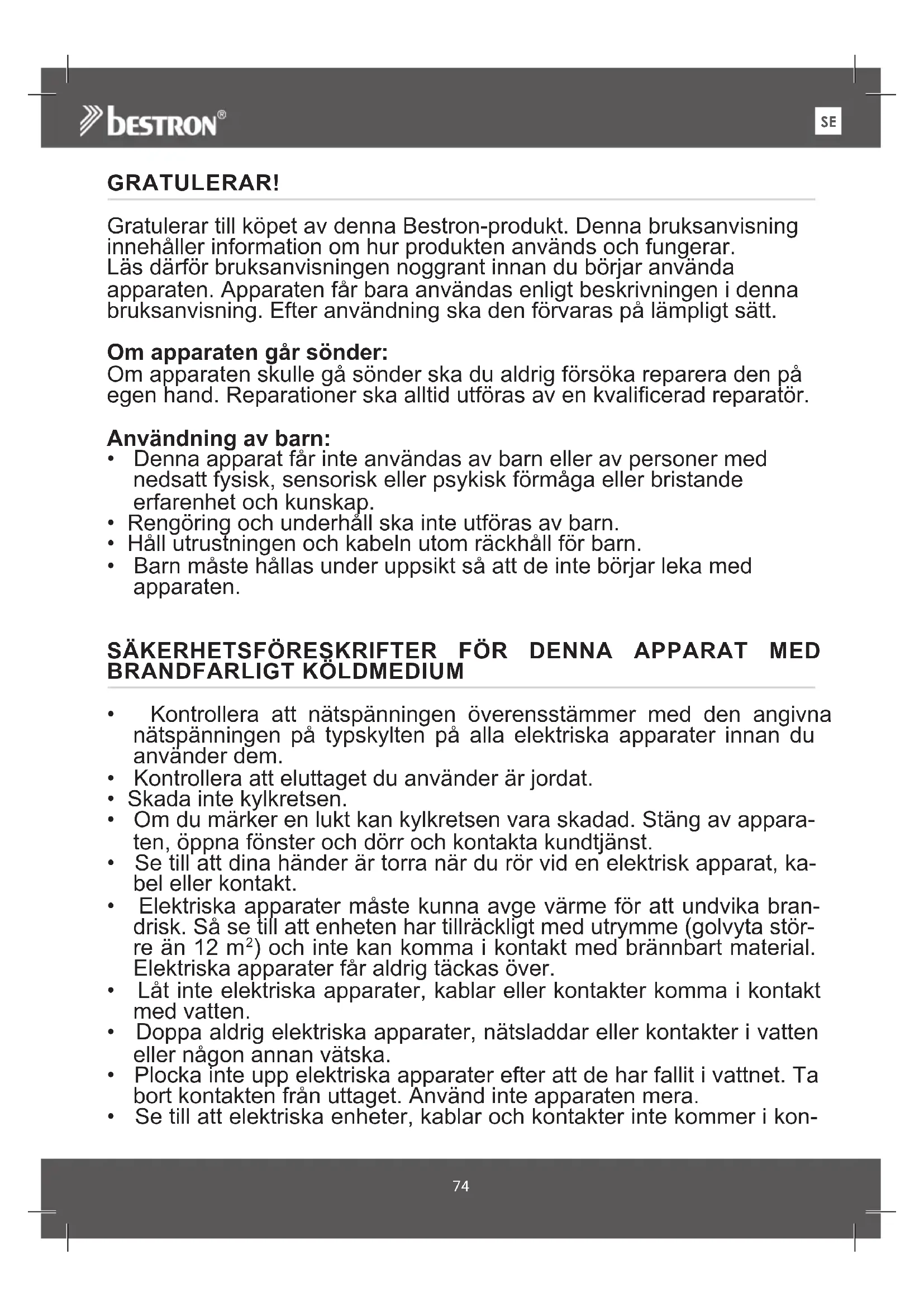 GRATULERAR! Gratulerar till köpet av denna Bestron-produkt. Denna bruksanvisning innehåller information om hur produkten används och fungerar. Läs därför bruksanvisningen noggrant innan du börjar använda apparaten. Apparaten får bara användas enligt beskrivningen i denna bruksanvisning. Efter användning ska den förvaras på lämpligt sätt. Om apparaten går sönder: Om apparaten skulle gå sönder ska du aldrig försöka reparera den på egen hand. Reparationer ska alltid utföras av en kvalificerad reparatör. Användning av barn: