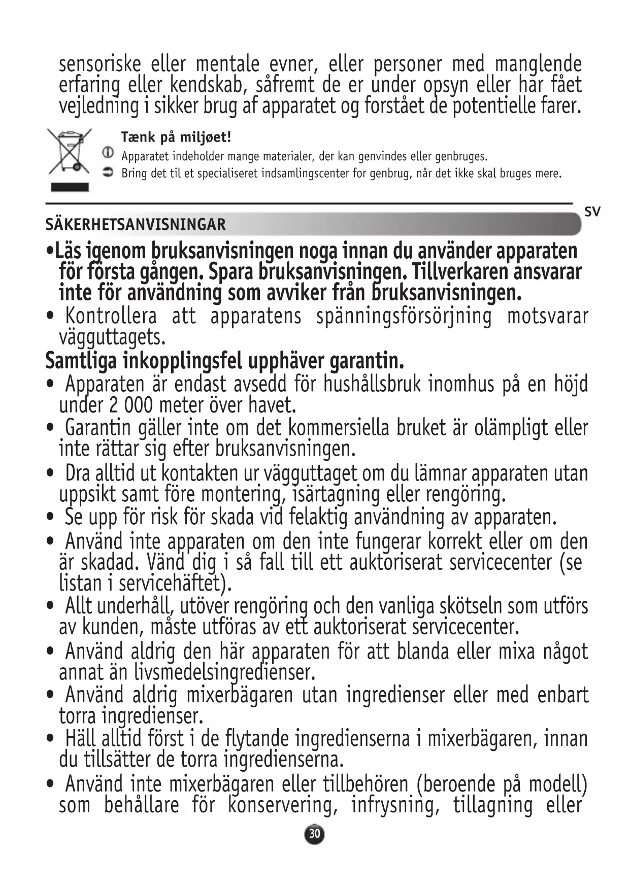 - Den här apparaten får användas av personer med funktionsnedsättningar (fysiska, sensoriska eller mentala), eller av personer som inte har tillräcklig erfarenhet av eller kunskap om hur apparaten används, förutsatt att de övervakas eller instrueras om hur apparaten kan användas på ett säkert sätt och att de är väl införstådda med eventuella risker som den medför. Tänk på miljön! Apparaten innehåller material som kan återanvändas eller återvinnas.Lämna den på en återvinningsstation när du inte längre vill ha den så att den kan tas om hand. TURVAOHJEET