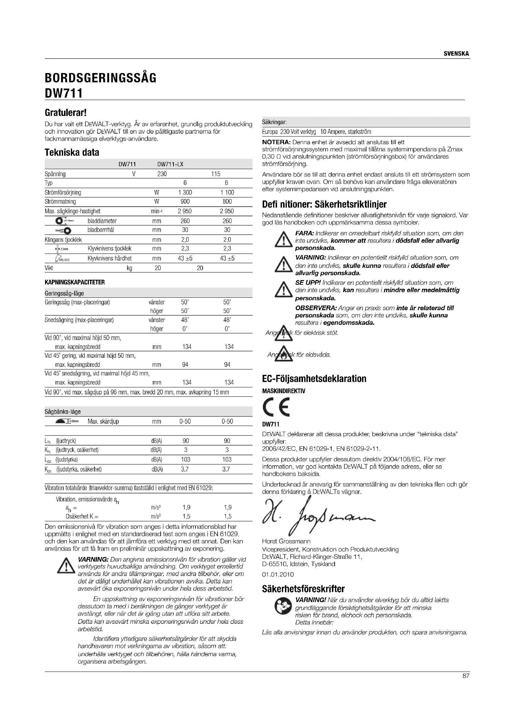 BORDSGERINGSSÅG DW711 Säkringar: Europa 230 Volt verktyg 10 Ampere, starkström NOTERA: Denna enhet är avsedd att anslutas till ett strömförsörjningssystem med maximal tillåtna systemimpendans på Zmax 0,30 Ω vid anslutningspunkten (strömförsörjningsbox) för användares strömförsörjning. Användare bör se till att denna enhet endast ansluts till ett strömsystem som uppfyller kraven ovan. Om så behövs kan användare fråga elleveratören efter systemimpedansen vid anslutningspunkten. Defi nitioner: Säkerhetsriktlinjer Nedanstående definitioner beskriver allvarlighetsnivån för varje signalord. Var god läs handboken och uppmärksamma dessa symboler. FARA: Indikerar en omedelbart riskfylld situation som, om den inte undviks, kommer att resultera i dödsfall eller allvarlig personskada. VARNING: Indikerar en potentiellt riskfylld situation som, om den inte undviks, skulle kunna resultera i dödsfall eller allvarlig personskada. SE UPP! Indikerar en potentiellt riskfylld situation som, om den inte undviks, kan resultera i mindre eller medelmåttig personskada. OBSERVERA: Anger en praxis som inte är relaterad till personskada som, om den inte undviks, skulle kunna resultera i egendomsskada. Anger risk för elektrisk stöt. Anger risk för eldsvåda. EC-Följsamhetsdeklaration MASKINDIREKTIV DW711 DEWALT deklarerar att dessa produkter, beskrivna under “tekniska data” uppfyller: 2006/42/EC, EN 61029-1, EN 61029-2-11. Dessa produkter uppfyller dessutom direktiv 2004/108/EC. För mer information, var god kontakta DEWALT på följande adress, eller se handbokens baksida. Undertecknad är ansvarig för sammanställning av den tekniska filen och gör denna förklaring å DEWALTs vägnar. Horst Grossmann Vicepresident, Konstruktion och Produktutveckling DEWALT, Richard-Klinger-Straße 11, D-65510, Idstein, Tyskland