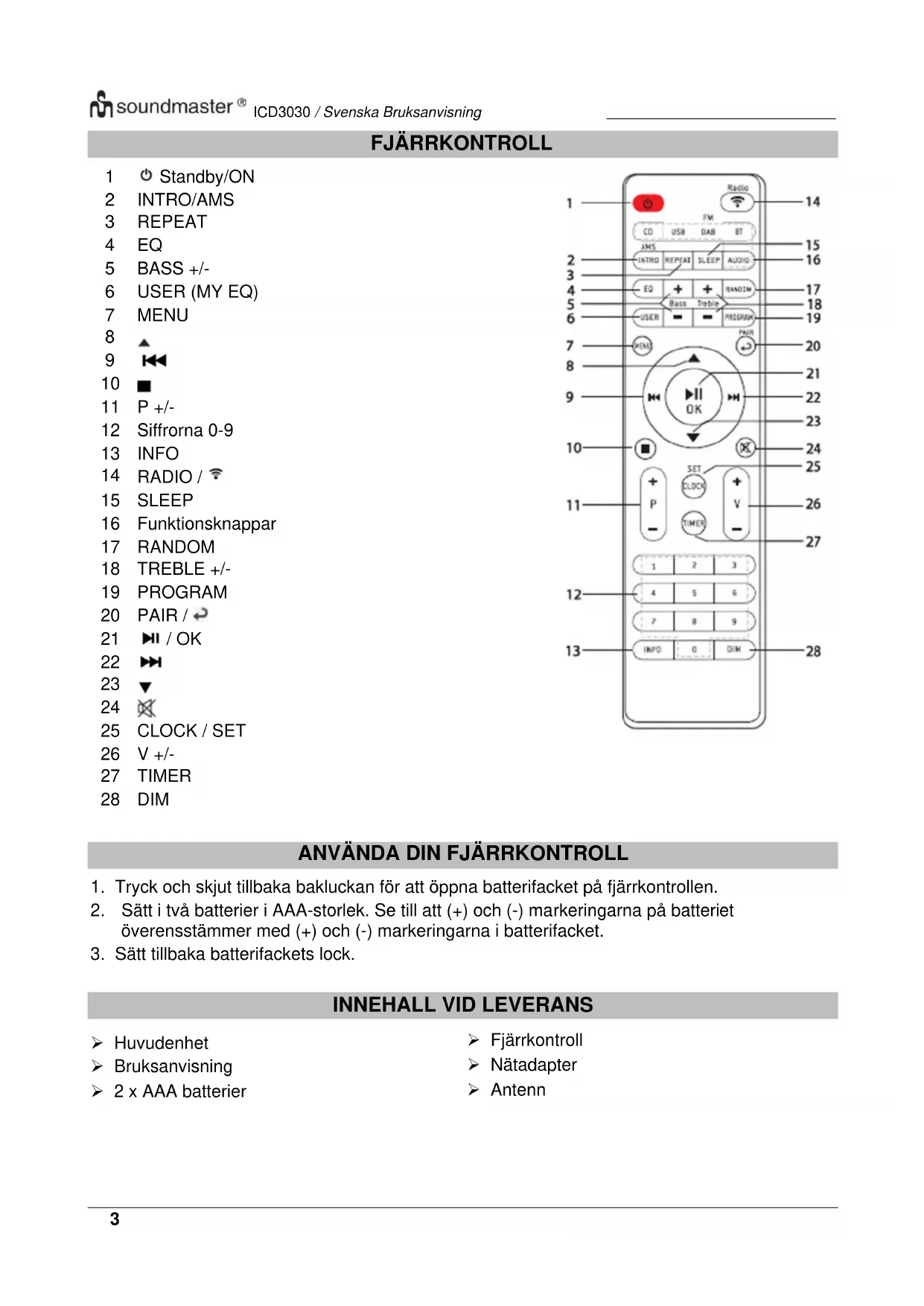 Huvudenhet Fjärrkontroll Bruksanvisning Nätadapter 2 x AAA batterier AntennICD3030 / Svenska Bruksanvisning