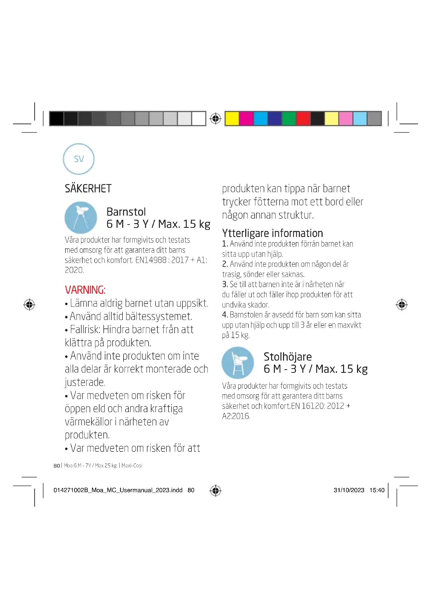 upp utan hjälp och upp till 3 år eller en maxvikt på 15 kg. Stolhöjare 6 M - 3 Y / Max. 15 kg Våra produkter har formgivits och testats med omsorg för att garantera ditt barns säkerhet och komfort. EN 16120: 2012 + A2:2016. VARNING: