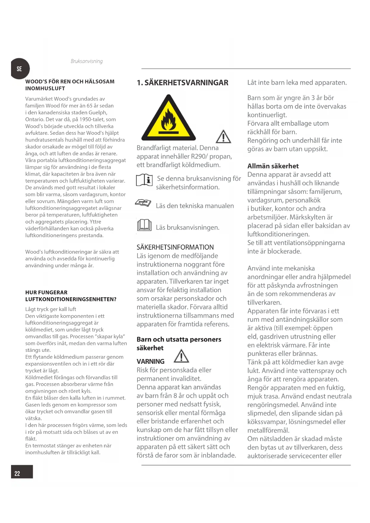 Brandfarligt material. Denna apparat innehåller R290/ propan, ett brandfarligt köldmedium. Se denna bruksanvisning för säkerhetsinformation. Läs den tekniska manualen Läs bruksanvisningen. SÄKERHETSINFORMATION Läs igenom de medföljande instruktionerna noggrant före installation och användning av apparaten. Tillverkaren tar inget ansvar för felaktig installation som orsakar personskador och materiella skador. Förvara alltid instruktionerna tillsammans med apparaten för framtida referens. Barn och utsatta personers säkerhet VARNING Risk för personskada eller permanent invaliditet. Denna apparat kan användas av barn från 8 år och uppåt och personer med nedsatt fysisk, sensorisk eller mental förmåga eller bristande erfarenhet och kunskap om de har fått tillsyn eller instruktioner om användning av apparaten på ett säkert sätt och förstå de faror som är inblandade. Låt inte barn leka med apparaten. Barn som är yngre än 3 år bör hållas borta om de inte övervakas kontinuerligt. Förvara allt emballage utom räckhåll för barn. Rengöring och underhåll får inte göras av barn utan uppsikt. Allmän säkerhet Denna apparat är avsedd att användas i hushåll och liknande tillämpningar såsom: familjerum, vardagsrum, personalkök i butiker, kontor och andra arbetsmiljöer. Märkskylten är placerad på sidan eller baksidan av luftkonditioneringen. Se till att ventilationsöppningarna inte är blockerade. Använd inte mekaniska anordningar eller andra hjälpmedel för att påskynda avfrostningen än de som rekommenderas av tillverkaren. Apparaten får inte förvaras i ett rum med antändningskällor som är aktiva (till exempel: öppen eld, gasdriven utrustning eller en elektrisk värmare. Får inte punkteras eller brännas. Tänk på att köldmedier kan avge lukt. Använd inte vattenspray och ånga för att rengöra apparaten. Rengör apparaten med en fuktig, mjuk trasa. Använd endast neutrala rengöringsmedel. Använd inte slipmedel, den slipande sidan på kökssvampar, lösningsmedel eller metallföremål. Om nätsladden är skadad måste den bytas ut av tillverkaren, dess auktoriserade servicecenter ellerSE