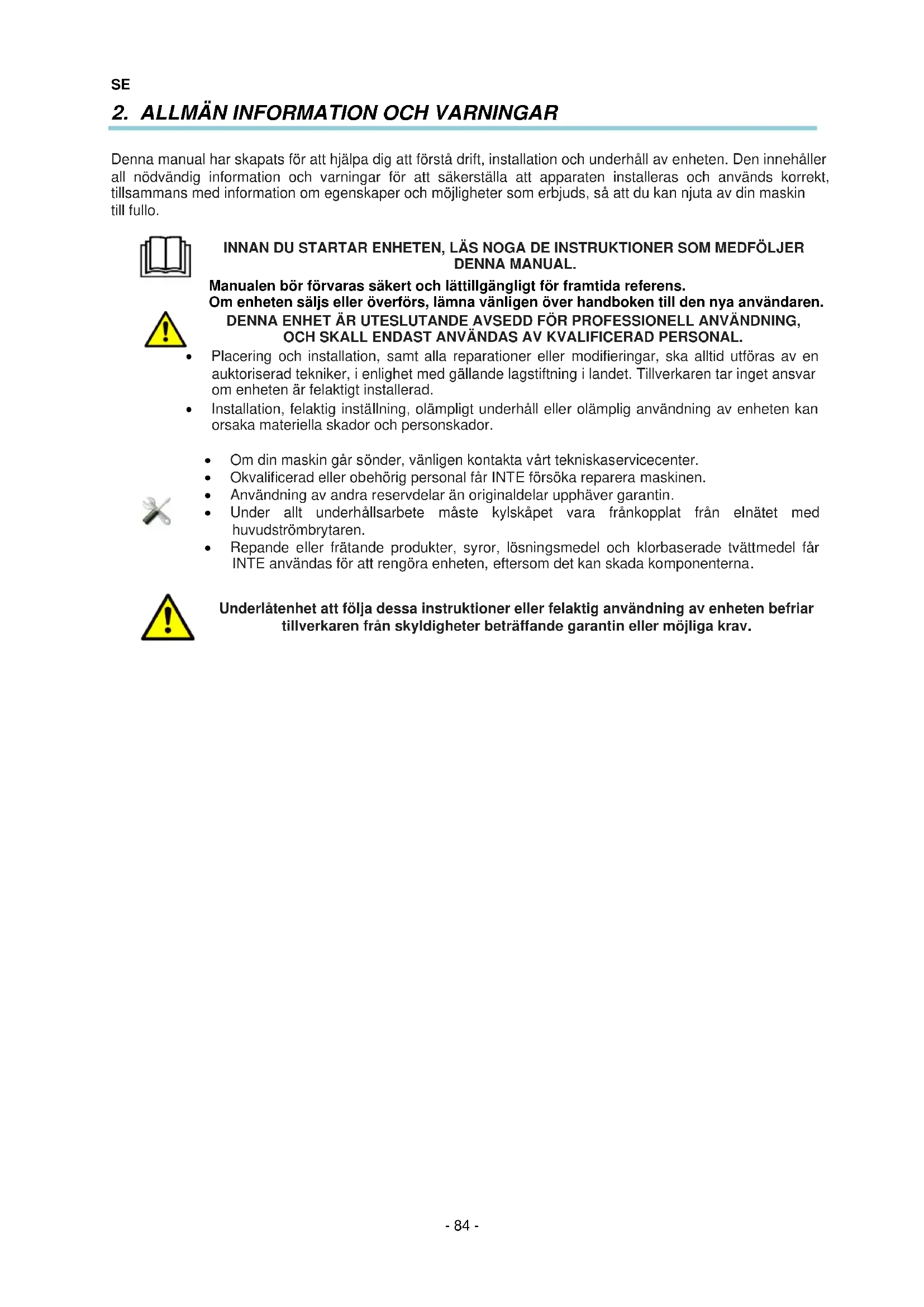 Denna manual har skapats för att hjälpa dig att förstå drift, installation och underhåll av enheten. Den innehåller all nödvändig information och varningar för att säkerställa att apparaten installeras och används korrekt, tillsammans med information om egenskaper och möjligheter som erbjuds, så att du kan njuta av din maskin till fullo.