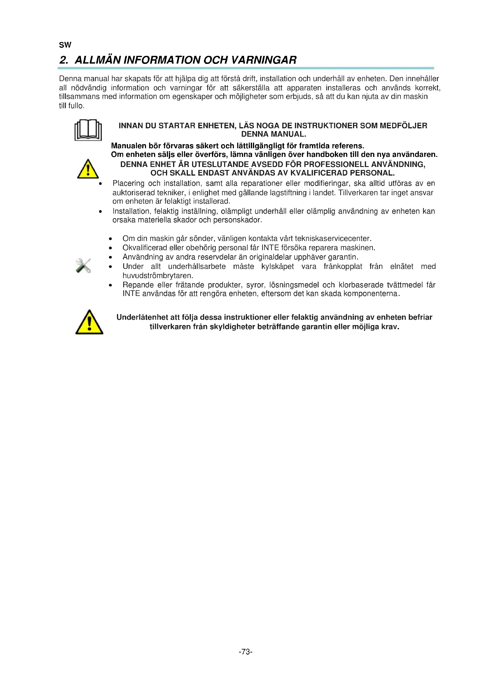 Kylskåp måste i sin slutliga position vara skiljd från väggen med 50 mm baktill, 30 mm i sidled och 500 mm till taket Om enheten är försedd med hjul, se till att golvet är helt plant. Vid idrifttagning, se till att det inte finns någon värmekälla i närheten. För att enheten ska kunna fungera optimalt är det mycket viktigt att alla luftintag, både i fläkten inne i bordet och i kondensorn, inte är förtäckta. Installera inte bordet utomhus. Inför inte något element från fläktskyddet eller i kylutrustningsområdet. Rengöring Första rengöringen måste utföras med vatten och neutralt rengöringsmedel. När allting är rent och torrt, sätt in tillbehören på lämpliga platser, enligt egen preferens. Vi rekommenderar daglig rengöring av utsidan av enheten med en fuktig trasa. Torka i samma riktning som det rostfria stålets polering. Slipmedel eller sådana som innehåller klor får inte användas. Skölj med rent vatten, undvik direkta vattenstrålar.SW