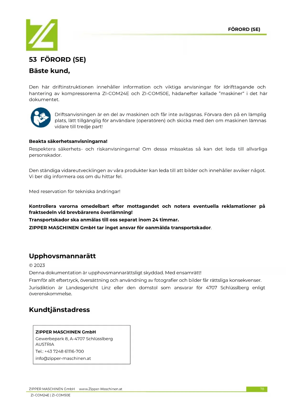 Den har driftinstrumenten innehaller information och viktiga anvisningar for idrifttagande och hantering av kompressorerna ZI-COM24E och ZI-COM50E, hadanefter kallade "maskiner" i det har dokumentet.