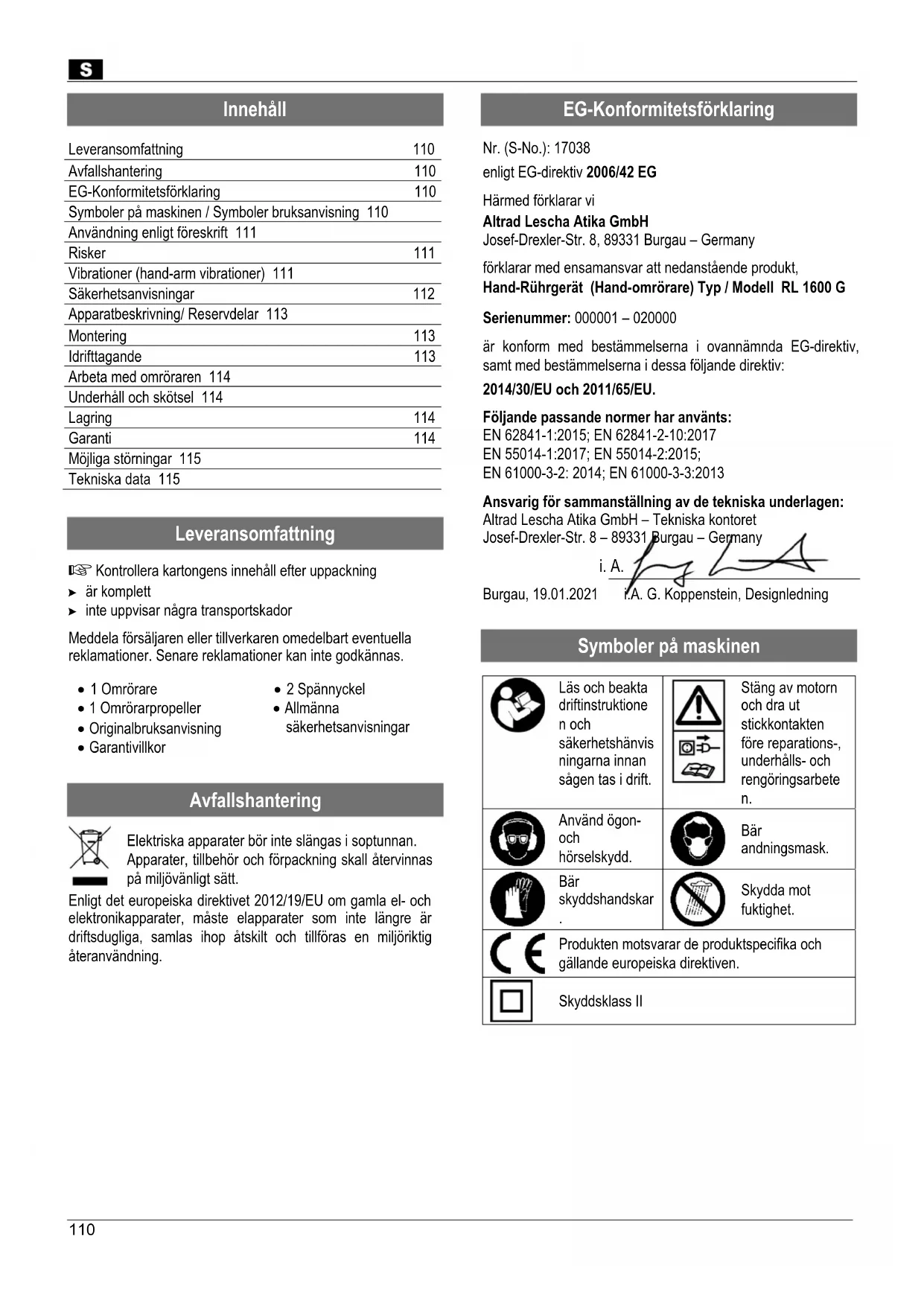 EG-Konformitetsförklaring Nr. (S-No.): 17038 enligt EG-direktiv 2006/42 EG Härmed förklarar vi Altrad Lescha Atika GmbH Josef-Drexler-Str. 8, 89331 Burgau – Germany förklarar med ensamansvar att nedanstående produkt, Hand-Rührgerät (Hand-omrörare) Typ / Modell RL 1600 G Serienummer: 000001 – 020000