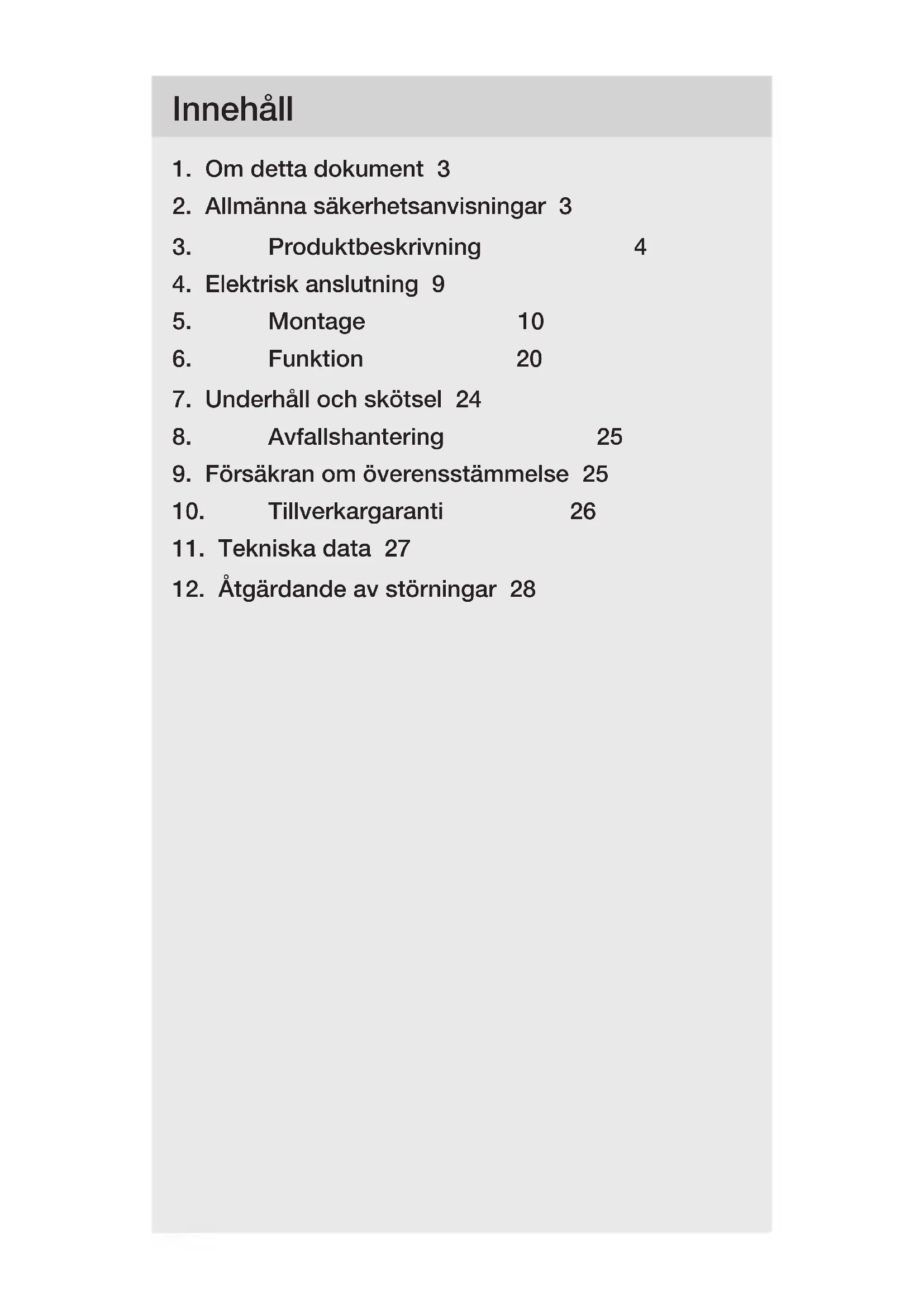 - Förvara den tillgängligt. – Hantering av elektrisk ström kan leda till farliga situa- tioner. Kontakt med strömförande delar kan medföra elektrisk chock, brännsår eller leda till döden. – Arbeten på nätspänningen får endast genomföras av kvalificerad yrkespersonal. – Installationsföreskrifter och anslutningskrav som gäller i respektive land ska iakttas (t.ex. DE: VDE 0100, AT: ÖVE-ÖNORM E8001-1, CH:SEV 1000). – Använd endast originalreservdelar.– 4 – Innehåll