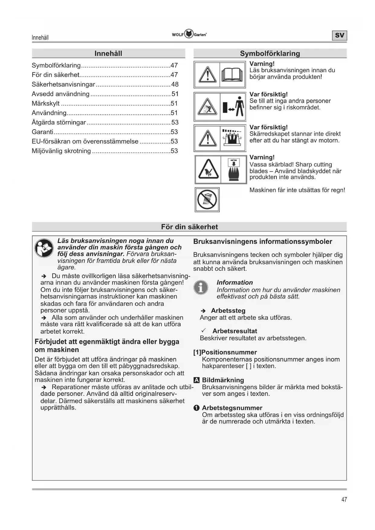 - Miljövänlig skrotning Symbolförklaring Varning! Läs bruksanvisningen innan du börjar använda produkten! Var försiktig! Se till att inga andra personer benner sig i riskområdet. Var försiktig! Skärredskapet stannar inte direkt efter att du har stängt av motorn. Varning! Vassa skärblad! Sharp cutting blades – Använd bladskyddet när produkten inte används. Maskinen får inte utsättas för regn! För din säkerhetSäkerhetsanvisningar p. 53