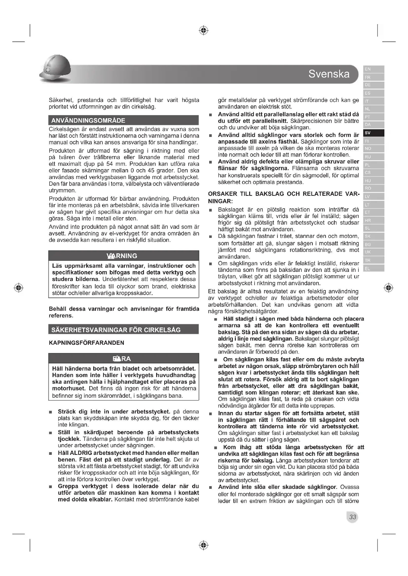 NINGAR: Ŷ Bakslaget är en plötslig reaktion som inträffar då sågklingan kläms till, vrids eller är fel inställd; sågen frigör sig då plötsligt från arbetsstycket och studsar häftigt bakåt mot användaren. Ŷ Då sågklingan fastnar i träet, stannar den och motorn, som fortsätter att gå, slungar sågen i motsatt riktning jämfört med sågklingans rotationsriktning, dvs mot användaren. Ŷ Om sågklingan vrids eller är felaktigt inställd, riskerar tänderna som finns på baksidan av den att sjunka in i träytan, vilket gör att sågklingan plötsligt kommer ut ur arbetsstycket i riktning mot användaren. Ett bakslag är alltså resultatet av en felaktig användning av verktyget och/eller av felaktiga arbetsmetoder eller arbetsförhållanden. Det kan undvikas genom att vidta några försiktighetsåtgärder. Ŷ Håll stadigt i sågen med båda händerna och placera armarna så att de kan kontrollera ett eventuellt bakslag. Stå på den ena sidan av sågen då du arbetar, aldrig i linje med sågklingan. Bakslaget slungar plötsligt sågen bakåt, men denna rörelse kan kontrolleras om användaren är förberedd på den. Ŷ Om sågklingan kilas fast eller om du måste avbryta arbetet av någon orsak, släpp strömbrytaren och håll sågen kvar i arbetsstycket ända tills sågklingan helt slutat att rotera. Försök aldrig att ta bort sågklingan från arbetsstycket, eller att dra sågklingan bakåt, samtidigt som klingan roterar; ett återkast kan ske. Om sågklingan kilas fast, ta reda på orsaken och vidta nödvändiga åtgärder för att detta inte upprepas. Ŷ Innan du startar sågen för att fortsätta arbetet, ställ in sågklingan rätt i förhållande till sågspåret och kontrollera att tänderna inte rör vid arbetsstycket. Om sågklingan sitter fast i arbetsstycket kan ett bakslag uppstå då du sätter i gång sågen. Ŷ Kom ihåg att stöda långa arbetsstycken för att undvika att sågklingan kilas fast och för att begränsa riskerna för bakslag. Långa arbetsstycken tenderar att böja sig under sin egen vikt. Du kan placera stöd på båda sidorna av arbetsstycket, nära skärlinjen och vid änden av arbetsstycket. Ŷ Använd inte slöa eller skadade sågklingor. Ovassa eller fel monterade sågklingor ger ett smalt sågspår som leder till en extrem friktion av sågklingan och till störreSvenska