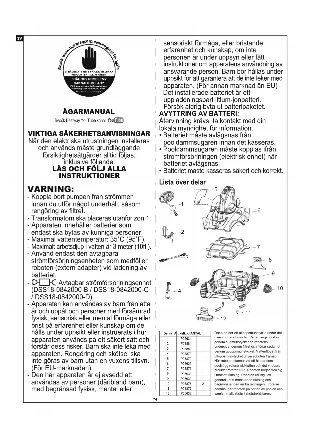 låsningen på kontakten och drar sedan ut det. OBS: Linda omgående ett isoleringsband runt kontakten för att undvika kortslutning som orsakas av kontakten av de båda trådanslutningarna. AVFALLSHANTERING Elektroniska produkter ska inte kastas tillsammans med hushållsavfall. Lämna in till en återvinningscentral. Kontrollera med din lokala myndighet eller återförsäljare angående återvinning. Felsökning Problem Roboten samlar inte upp skräp. Roboten rör sig långsamt. Roboten slutade röra sig mitt i poolen (det vridbara huvudet vrider fortfarande). Roboten stoppas av sugkraften från poolens golvavlopp. För assistans, besök hjälpavdelningen på vår webbplats, www.bestwaycorp.com. Kontrollera om det finns föremål som hindrar rengöraren. Ta bort föremålet. Rengör filterbehållaren och ladda roboten igen i 5 till 6 timmar Följ instruktionerna i bruksanvisningen för att ställa in låsstiftets position korrekt och applicera stötfångaren. Se till att stötfångaren har installerats (se anvisningarna i bruksanvisningen). Följ anvisningarna i bruksanvisningen för att applicera stötfångare på båda sidor på roboten. Driftstiden är kortare än väntat. Låsstiftets position är inte korrekt / stötfångare krävs. Roboten rör sig längs med poolväggarna i rund pool. Inte tillräckligt med utrymme för roboten att ändra riktningar. Flyttningsriktningen avbryts av genererad vattencirkulation genom filtreringssystemet. Stäng av roboten och kontrollera visuellt hålet under skräpet. För assistans, besök hjälpavdelningen på vår webbplats, www.bestwaycorp.com. VARNING! Försäkra dig om att strömmen är avstängd innan robotenheten kontrolleras. Roboten täcker inte hela poolen / rör sig längs poolväggarna. Roboten fångad i den smala platsen i grund pool. Möjlig orsak Batteriet är lågt. Ladda roboten igen. Rengör skräpbehållaren och filterhöljet. Stäng av filtreringssystemet (se anvisningarna i bruksanvisningen). Rengör skräpbehållaren Stäng av filtreringssystemet (se anvisningarna i bruksanvisningen). Kontrollera och ta bort skräpet från hjulet. Rengör skräpbehållaren och filterhöljet. Impellern har fastnat. Impellern är trasig. Skräpbehållaren är full. Roboten stoppad av hinder. Skräpbehållaren är full. Hjulet har fastnat. Skräpbehållaren är full. Lösning79 Skräp tar sig ut från roboten. Flötet sjunker. Se till att dräneringsfilterplattan är på plats och ersätt med en ny till nästa användning om det är nödvändigt. Ersätt med ett nytt filterhölje. För assistans, besök hjälpavdelningen på vår webbplats, www.bestwaycorp.com. Lossa vridhuvudet och friktionsringen enligt instruktionerna i avsnittet "Hur batteriet ska avlägsnas" i bruksanvisningen, och: - Ta bort skräp som fastnat - Säkerställ att friktionsringen på bottenplattan är korrekt installerad (se diagrammen nedan) - Kontrollera friktionsringen för eventuella skador och slitage. Ersätt med en ny vid behov Sugmunstyckets klaff (på rengörarens undersida) är sönder. Dräneringsfilterplattan är sönder eller inte på plats. Ersätt med en ny ring. För assistans, besök hjälpavdelningen på vår webbplats, www.bestwaycorp.com. Ersätt med ett nytt flöte. För assistans, besök hjälpavdelningen på vår webbplats, www.bestwaycorp.com. VARNING! För assistans, besök hjälpavdelningen på vår webbplats, www.bestwaycorp.com. ÖPPNA INTE roboten och ersätt batteriet på egen hand. Det kan resultera i allvarliga eller livshotande skador och garantin blir även ogiltigförklarad. För assistans, besök hjälpavdelningen på vår webbplats, www.bestwaycorp.com. VARNING! Genom användning av fel extern adapter kan skada uppkomma på roboten / batteriet och därmed kommer garantin ogiltigförklaras. Se till att laddkabeln är korrekt och fullständigt ansluten till den externa adaptern och roboten. Se anvisningarna i bruksanvisningen. Sugmunstyckets klaff fungerar som en dörr för att förhindra att skräpet tar sig ut från skräpbehållaren. För assistans, besök hjälpavdelningen på vår webbplats, www.bestwaycorp.com. Laddkabeln är inte fullständigt ansluten med den externa adaptern och roboten. Vridbara huvudet vrider inte eller vrider sig märkbart långsamt. Skräp tar sig utanför filterhöljet. Roboten kan inte laddas / återuppladdas. Kontrollera och ta bort eventuellt skräp som hindrar klaffens rörelse. Det vridbara huvudets undersida har fastnat. Sidklaffen har fastnat. Det vridbara huvudets ring är sönder. Filterhöljets nät är skadat. Flötet är sönder och vatten kommer in. Batteriet är skadat. Den externa adaptern fungerar inte.For support please visit us at: bestwaycorp.com/support ©2020 Bestway Inflatables & Material Corp. All rights reserved/Tous droits réservés/Todos los derechos reservados/Alle Rechte vorbehalten/Tutti i diritti riservati ®™ Trademarks used in some countries under license to/ Marques ®™ utilisées dans certains pays sous la licence de/ Marcas comerciales ®™ utilizadas en algunos países bajo la licencia de/ ®™ Die Warenzeichen werden in einigen Ländern verwendet unter Lizenz der/ ®™ Marchi utilizzati in alcuni paesi concessi in licenza a Bestway Inflatables & Material Corp., No.3065 Cao An Road, Shanghai, 201812, China. Manufactured,distributed and represented in the European Union by/ Fabriqués, distribués et représentés dans l’Union Européenne par/Fabricado, distribuido y representado en la Unión Europea por/ Hergestellt, vertrieben und in der Europäischen Union vertreten von/Prodotto, distribuito e rappresentato nell'Unione Europea da Bestway (Europe) S.r.l., Via Resistenza, 5, 20098 San Giuliano Milanese (Milano), Italy Distributed in North America by/Distribués en Amérique du Nord par/Distribuido en Norteamérica por Bestway (USA) Inc., 3411 E. Harbour Drive, Phoenix, Arizona 85034, United States of America Tel: +86 21 69135588 (For U.S. and Canada) Distributed i