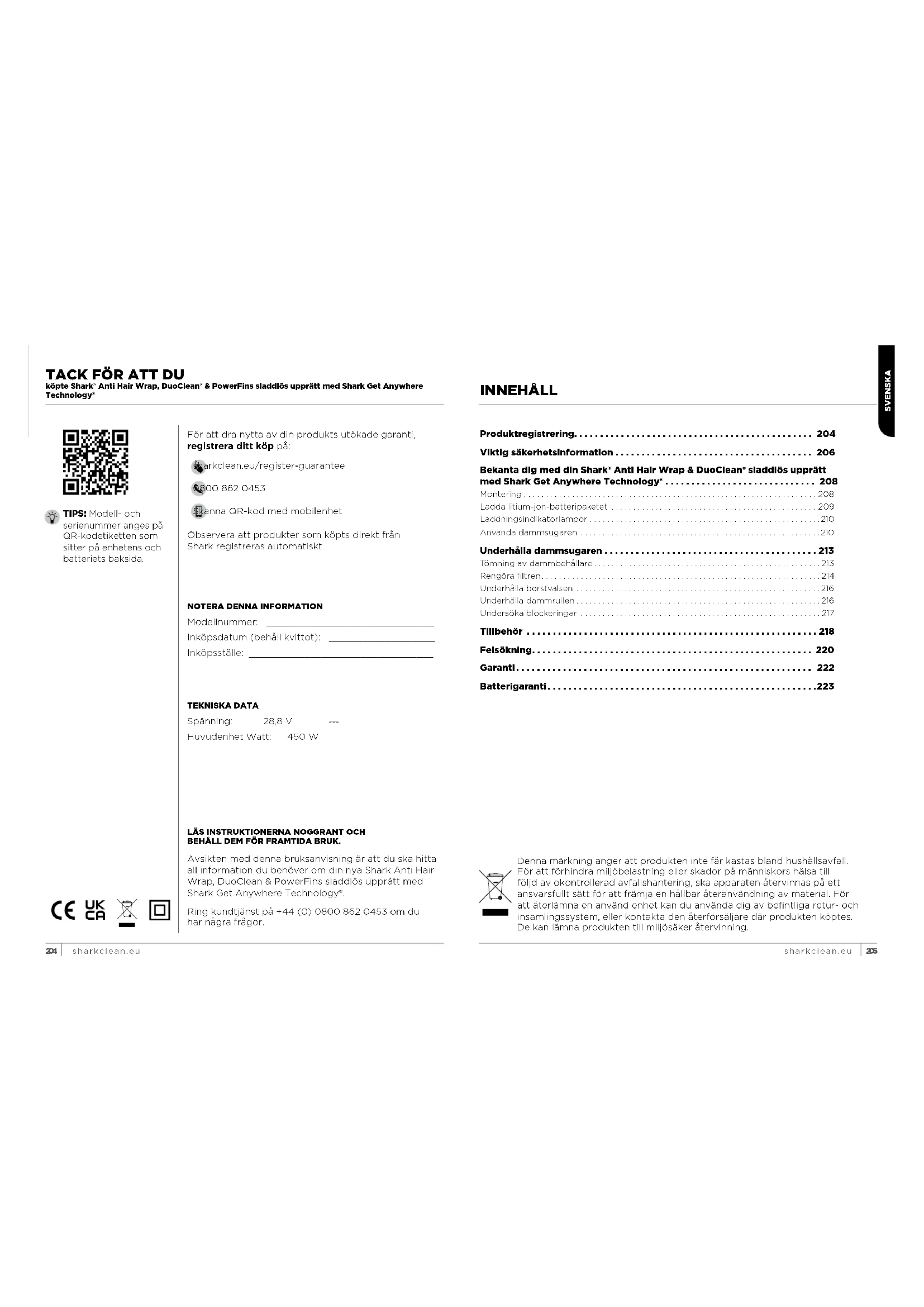 BEHÅLL DEM FÖR FRAMTIDA BRUK. Avsikten med denna bruksanvisning är att du ska hitta all information du behöver om din nya Shark Anti Hair Wrap, DuoClean & PowerFins sladdlös upprätt med Shark Get Anywhere Technology®. Ring kundtjänst på +44 (0) 0800 862 0453 om du har några frågor. TEKNISKA DATA Spänning: 28,8 V Huvudenhet Watt: 450 W TIPS: Modell- och serienummer anges på QR-kodetiketten som sitter på enhetens och batteriets baksida.