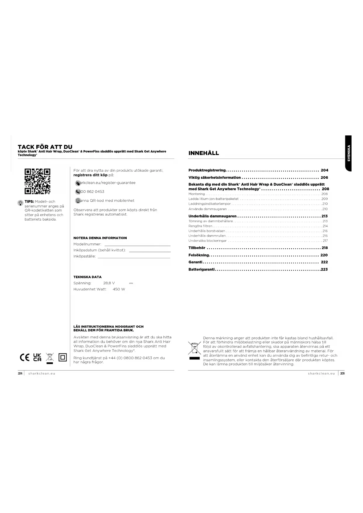 BEHÅLL DEM FÖR FRAMTIDA BRUK. Avsikten med denna bruksanvisning är att du ska hitta all information du behöver om din nya Shark Anti Hair Wrap, DuoClean & PowerFins sladdlös upprätt med Shark Get Anywhere Technology®. Ring kundtjänst på +44 (0) 0800 862 0453 om du har några frågor. TEKNISKA DATA Spänning: 28,8 V Huvudenhet Watt: 450 W TIPS: Modell- och serienummer anges på QR-kodetiketten som sitter på enhetens och batteriets baksida.