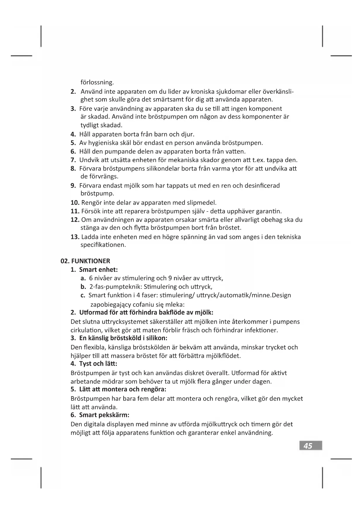 a. 6 nivåer av smulering och 9 nivåer av uryck, b. 2-fas-pumpteknik: Smulering och uryck, c. Smart funkon i 4 faser: smulering/ uryck/automak/minne.Design zapobiegający cofaniu się mleka: