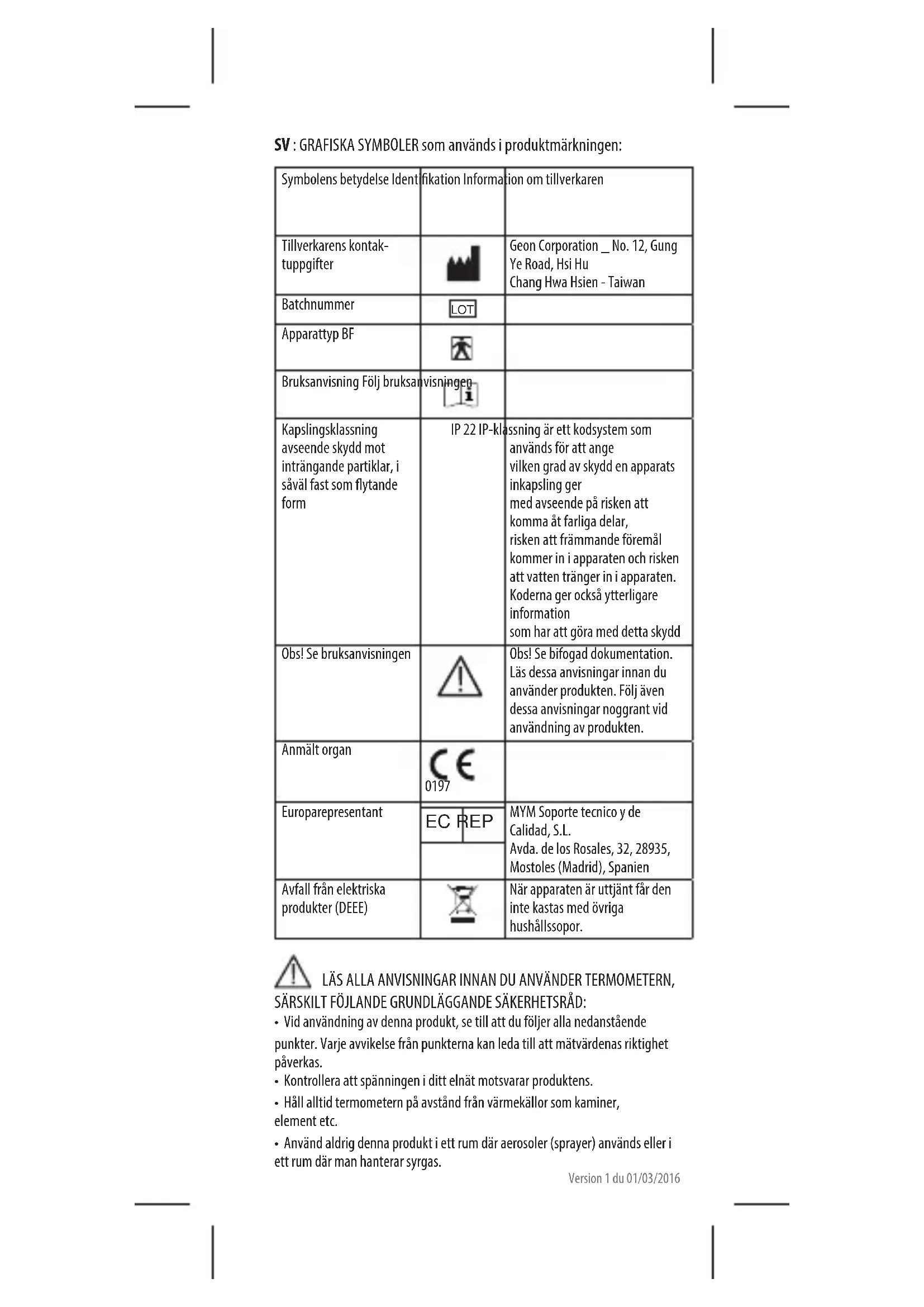 MYM Soporte tecnico y de Calidad, S.L . Avda. de los Rosales, 32, 28935, Mostoles (Madrid), SpainVersion 1 du 01/03/2016 SV : GRAFISKA SYMBOLER som används i produktmärkningen: Symbolens betydelse Identikation Information om tillverkaren Tillverkarens kontak- tuppgifter Geon Corporation _ No. 12, Gung Ye Road, Hsi Hu Chang Hwa Hsien - Taiwan Batchnummer LOT Apparattyp BF Bruksanvisning Följ bruksanvisningen Kapslingsklassning avseende skydd mot inträngande partiklar, i såväl fast som ytande form IP 22 IP-klassning är ett kodsystem som används för att ange vilken grad av skydd en apparats inkapsling ger med avseende på risken att komma åt farliga delar, risken att främmande föremål kommer in i apparaten och risken att vatten tränger in i apparaten. Koderna ger också ytterligare information som har att göra med detta skydd Obs! Se bruksanvisningen Obs! Se bifogad dokumentation. Läs dessa anvisningar innan du använder produkten. Följ även dessa anvisningar noggrant vid användning av produkten. Anmält organ