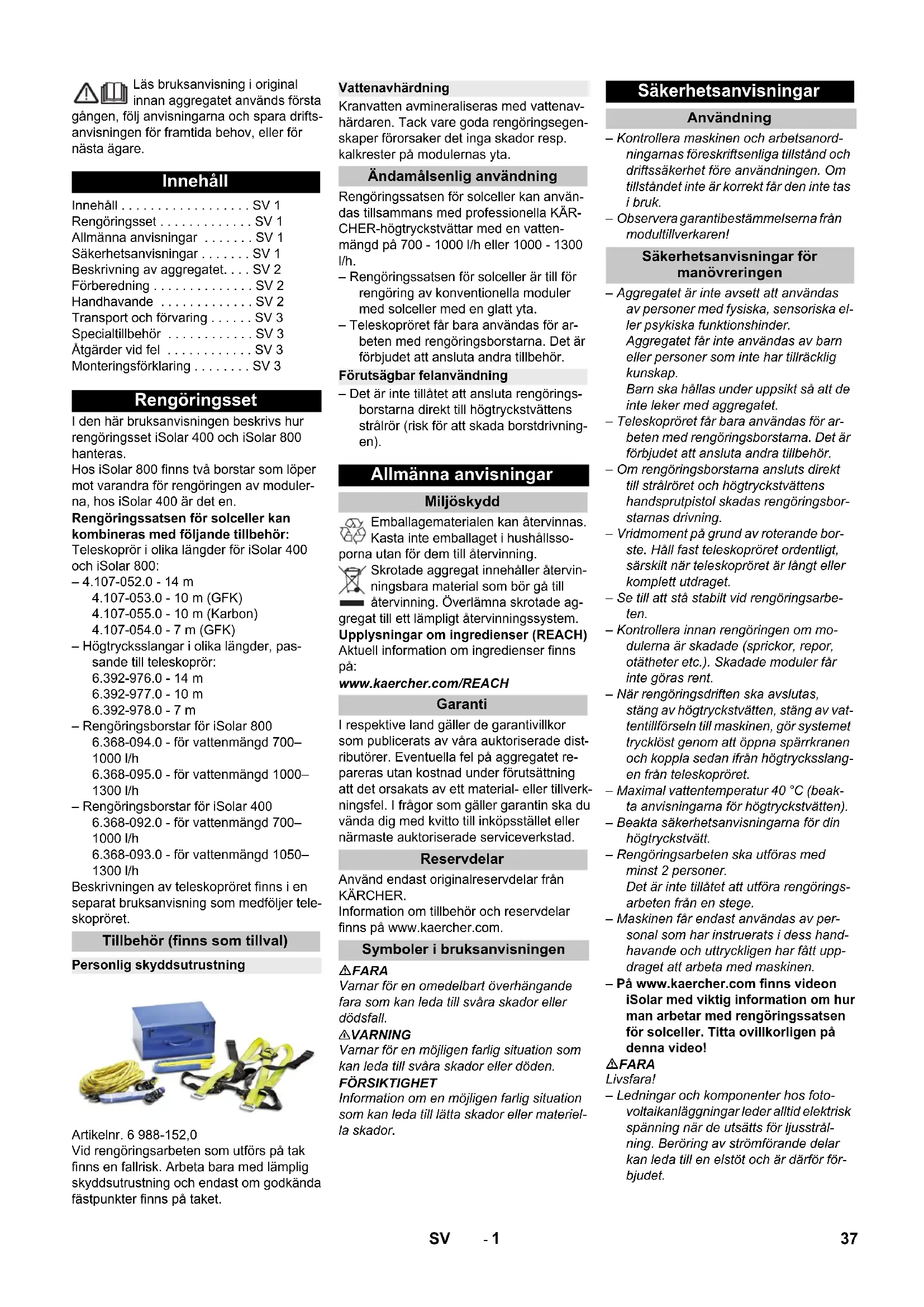 - kan kun brukes med enkeltbørste Feilretting Høytrykksvasker kobler inn/ut Rengjøringsbørste dreier ikke Maskinen suger ikke rengjøringsmiddel Klemmen på teleskoplansen holder ikke skikkelig Låsehendel Bestillingsnr. ø 36 mm 6.373-995.0 ø 34 mm 6.373-996.0 ø 28 mm 6.373-997.0 Monteringserklæring Produkt: Tilbehør iSolar 400 iSolar 800 Type: 6.368-092.0, 6.368-093.0 6.368-094.0, 6.368-095.0 Anvendte overensstemmende normer I henhold til: EN 60335–2–79 Chairman of the Board of Management Director Regulatory Affairs & Certification 36 NO- 1 Läs bruksanvisning i original innan aggregatet används första gången, följ anvisningarna och spara drifts- anvisningen för framtida behov, eller för nästa ägare. I den här bruksanvisningen beskrivs hur rengöringsset iSolar 400 och iSolar 800 hanteras. Hos iSolar 800 finns två borstar som löper mot varandra för rengöringen av moduler- na, hos iSolar 400 är det en. Rengöringssatsen för solceller kan kombineras med följande tillbehör: Teleskoprör i olika längder för iSolar 400 och iSolar 800: – 4.107-052.0 - 14 m 4.107-053.0 - 10 m (GFK) 4.107-055.0 - 10 m (Karbon) 4.107-054.0 - 7 m (GFK) – Högtrycksslangar i olika längder, pas- sande till teleskoprör: 6.392-976.0 - 14 m 6.392-977.0 - 10 m 6.392-978.0 - 7 m – Rengöringsborstar för iSolar 800 6.368-094.0 - för vattenmängd 700– 1000 l/h 6.368-095.0 - för vattenmängd 1000– 1300 l/h – Rengöringsborstar för iSolar 400 6.368-092.0 - för vattenmängd 700– 1000 l/h 6.368-093.0 - för vattenmängd 1050– 1300 l/h Beskrivningen av teleskopröret finns i en separat bruksanvisning som medföljer tele- skopröret. Artikelnr. 6 988-152,0 Vid rengöringsarbeten som utförs på tak finns en fallrisk. Arbeta bara med lämplig skyddsutrustning och endast om godkända fästpunkter finns på taket. Kranvatten avmineraliseras med vattenav- härdaren. Tack vare goda rengöringsegen- skaper förorsaker det inga skador resp. kalkrester på modulernas yta. Rengöringssatsen för solceller kan använ- das tillsammans med professionella KÄR- CHER-högtryckstvättar med en vatten- mängd på 700 - 1000 l/h eller 1000 - 1300 l/h. – Rengöringssatsen för solceller är till för rengöring av konventionella moduler med solceller med en glatt yta. – Teleskopröret får bara användas för ar- beten med rengöringsborstarna. Det är förbjudet att ansluta andra tillbehör. – Det är inte tillåtet att ansluta rengörings- borstarna direkt till högtryckstvättens strålrör (risk för att skada borstdrivning- en). Emballagematerialen kan återvinnas. Kasta inte emballaget i hushållsso- porna utan för dem till återvinning. Skrotade aggregat innehåller återvin- ningsbara material som bör gå till återvinning. Överlämna skrotade ag- gregat till ett lämpligt återvinningssystem. Upplysningar om ingredienser (REACH) Aktuell information om ingredienser finns på: www.kaercher.com/REACH I respektive land gäller de garantivillkor som publicerats av våra auktoriserade dist- ributörer. Eventuella fel på aggregatet re- pareras utan kostnad under förutsättning att det orsakats av ett material- eller tillverk- ningsfel. I frågor som gäller garantin ska du vända dig med kvitto till inköpsstället eller närmaste auktoriserade serviceverkstad. Använd endast originalreservdelar från KÄRCHER. Information om tillbehör och reservdelar finns på www.kaercher.com. FARA Varnar för en omedelbart överhängande fara som kan leda till svåra skador eller dödsfall. 몇 VARNING Varnar för en möjligen farlig situation som kan leda till svåra skador eller döden. FÖRSIKTIGHET Information om en möjligen farlig situation som kan leda till lätta skador eller materiel- la skador. – Kontrollera maskinen och arbetsanord- ningarnas föreskriftsenliga tillstånd och driftssäkerhet före användningen. Om tillståndet inte är korrekt får den inte tas i bruk. – Observera garantibestämmelserna från modultillverkaren! – Aggregatet är inte avsett att användas av personer med fysiska, sensoriska el- ler psykiska funktionshinder. Aggregatet får inte användas av barn eller personer som inte har tillräcklig kunskap. Barn ska hållas under uppsikt så att de inte leker med aggregatet. – Teleskopröret får bara användas för ar- beten med rengöringsborstarna. Det är förbjudet att ansluta andra tillbehör. – Om rengöringsborstarna ansluts direkt till strålröret och högtryckstvättens handsprutpistol skadas rengöringsbor- starnas drivning. – Vridmoment på grund av roterande bor- ste. Håll fast teleskopröret ordentligt, särskilt när teleskopröret är långt eller komplett utdraget. – Se till att stå stabilt vid rengöringsarbe- ten. – Kontrollera innan rengöringen om mo- dulerna är skadade (sprickor, repor, otätheter etc.). Skadade moduler får inte göras rent. – När rengöringsdriften ska avslutas, stäng av högtryckstvätten, stäng av vat- tentillförseln till maskinen, gör systemet trycklöst genom att öppna spärrkranen och koppla sedan ifrån högtrycksslang- en från teleskopröret. – Maximal vattentemperatur 40 °C (beak- ta anvisningarna för högtryckstvätten). – Beakta säkerhetsanvisningarna för din högtryckstvätt. – Rengöringsarbeten ska utföras med minst 2 personer. Det är inte tillåtet att utföra rengörings- arbeten från en stege. – Maskinen får endast användas av per- sonal som har instruerats i dess hand- havande och uttryckligen har fått upp- draget att arbeta med maskinen. – På www.kaercher.com finns videon iSolar med viktig information om hur man arbetar med rengöringssatsen för solceller. Titta ovillkorligen på denna video! FARA Livsfara! – Ledningar och komponenter hos foto- voltaikanläggningar leder alltid elektrisk spänning när de utsätts för ljusstrål- ning. Beröring av strömförande delar kan leda till en elstöt och är därför för- bjudet. Innehåll Innehåll . . . 