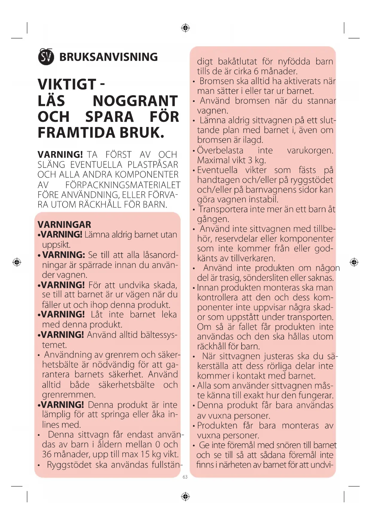 - Denna sittvagn får endast använ- das av barn i åldern mellan 0 och 36 månader, upp till max 15 kg vikt.